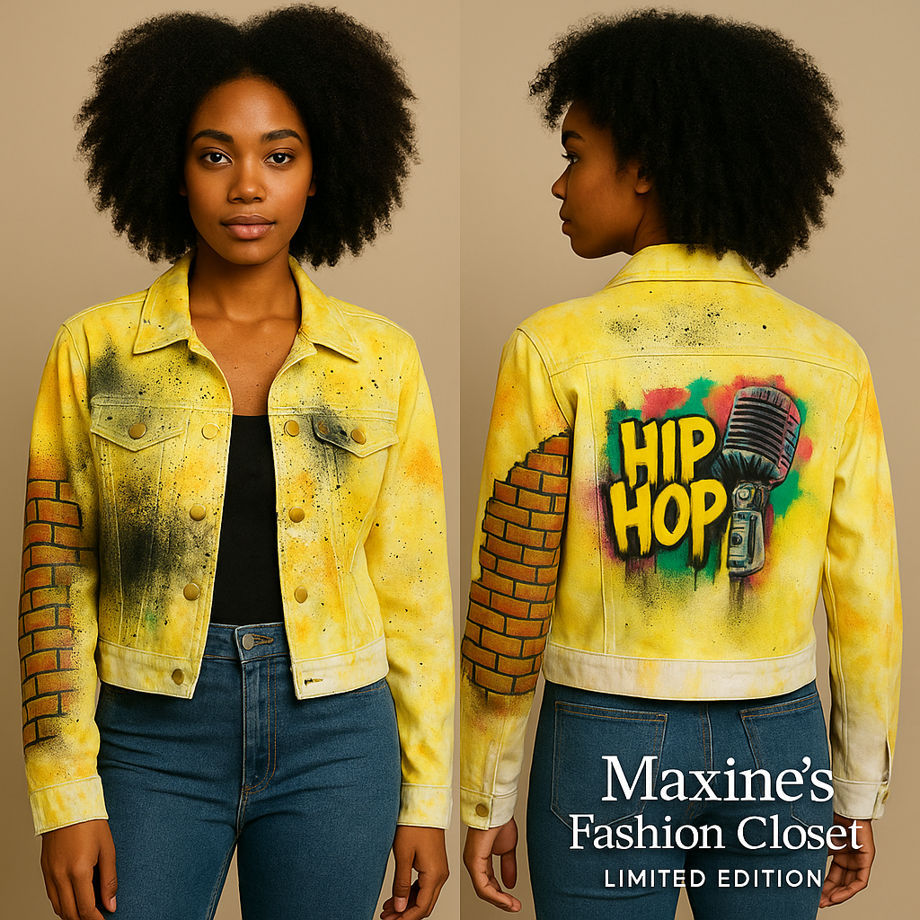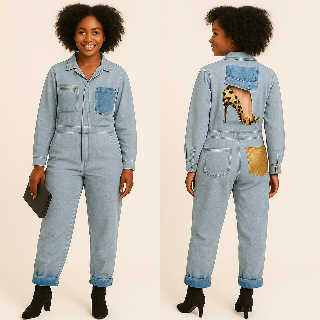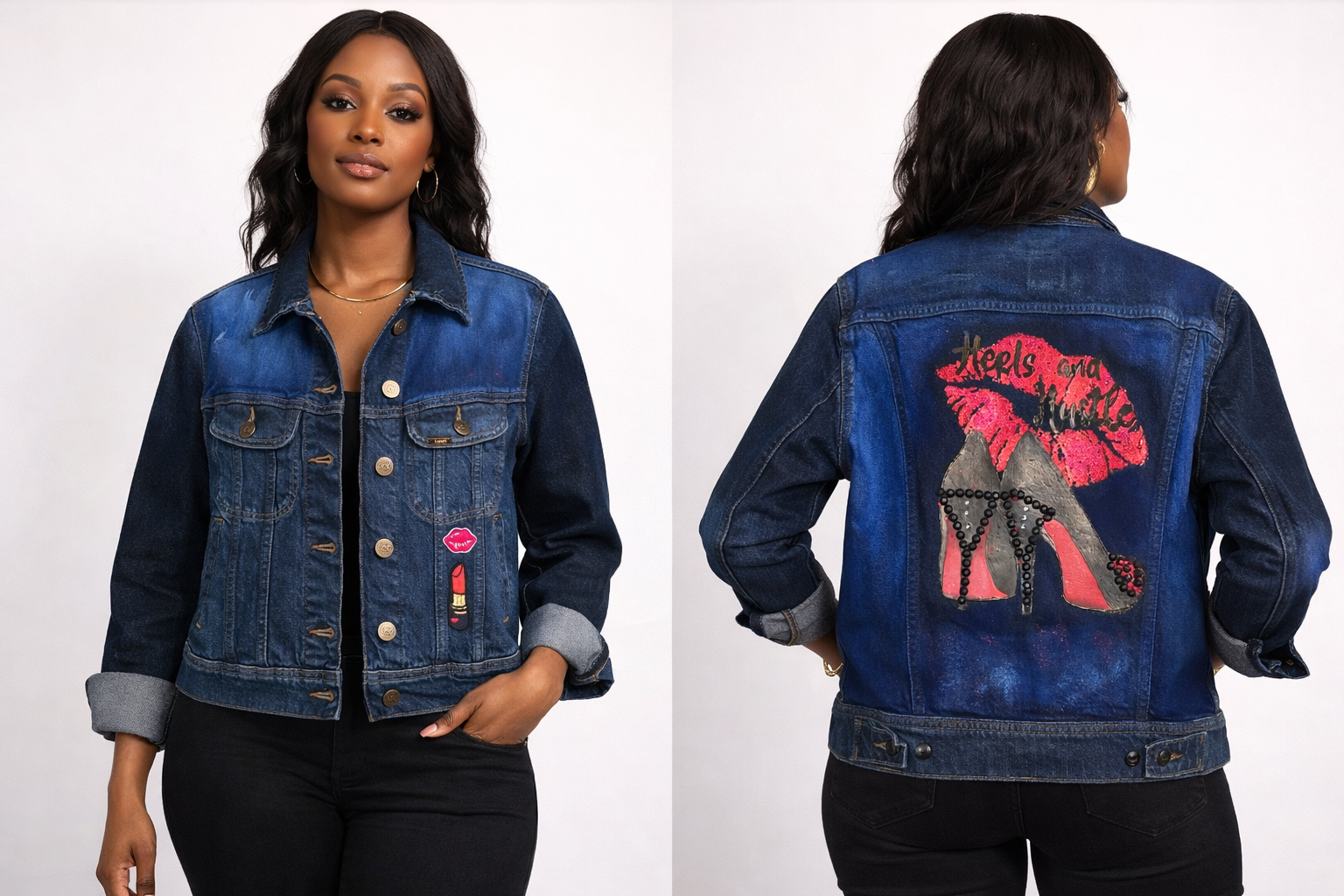 • Heels Speak Louder” Denim Jacket – Maxine Fashion Remix