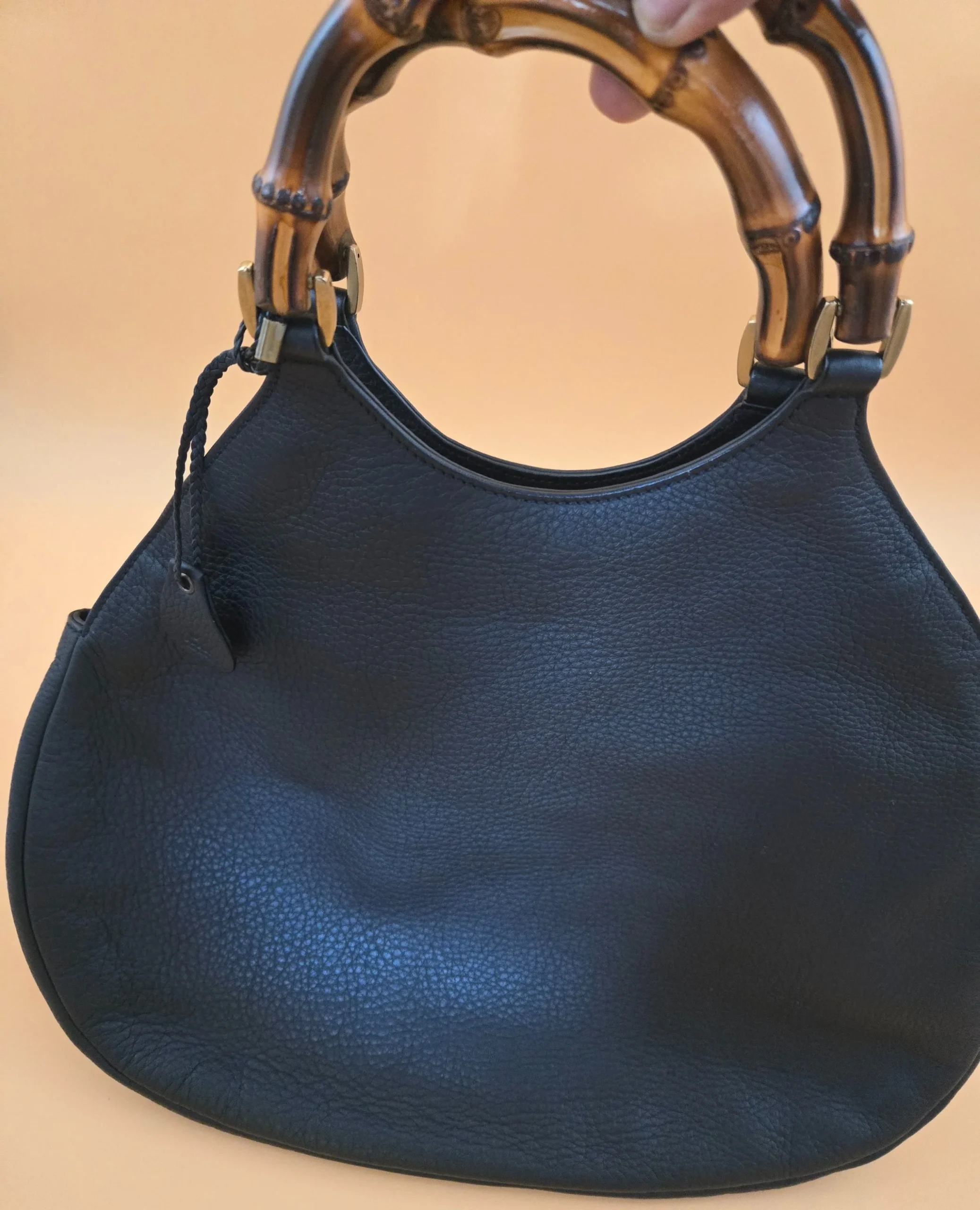 GUCCI VINTAGE BLACK LEATHER BAMBOO HANDBAG MEDUIM PEBBLED SATCHEL TOTE BAG.