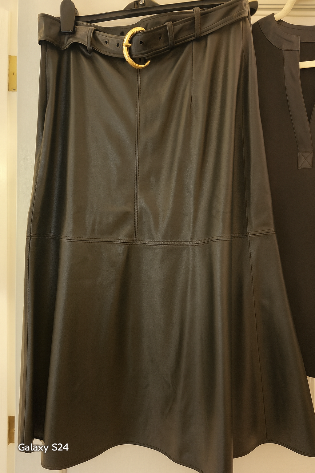 Elevate your wardrobe with this black faux leather flared midi skirt, designed for timeless style and modern edge. Crafted with a sleek faux leather finish, this piece flows effortlessly into a gentle flare for a flattering silhouette. The skirt is cinched at the waist with a wide faux leather belt, finished with a bold round gold-tone buckle that adds just the right touch of luxury. Perfect for pairing with fitted tops, blouses, or even cozy knits, this skirt transitions seamlessly from day to night. Whether styled with heels for a chic evening look or boots for casual sophistication, it’s a versatile piece that makes a statement in every setting.