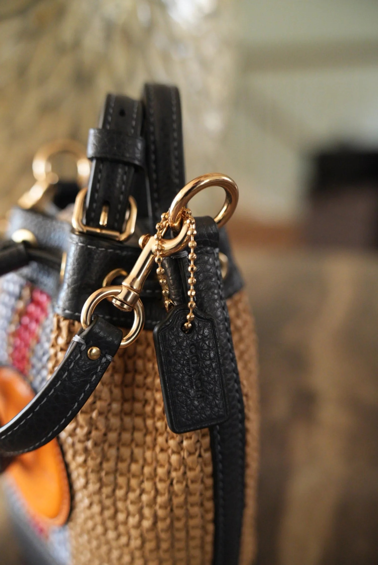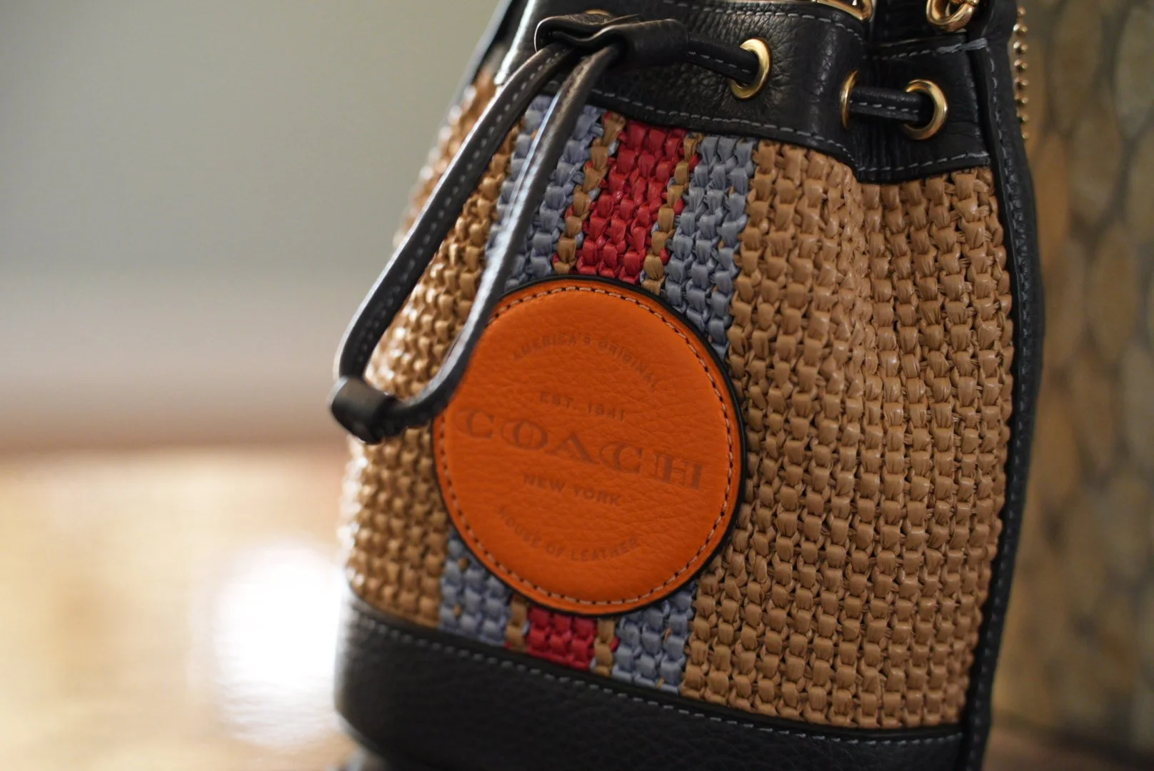 This straw and leather trim Coach Bucket is the perfect summer bag hold all of your essentials . Drawstring closure detachable crossbody strap or hold the top handle.