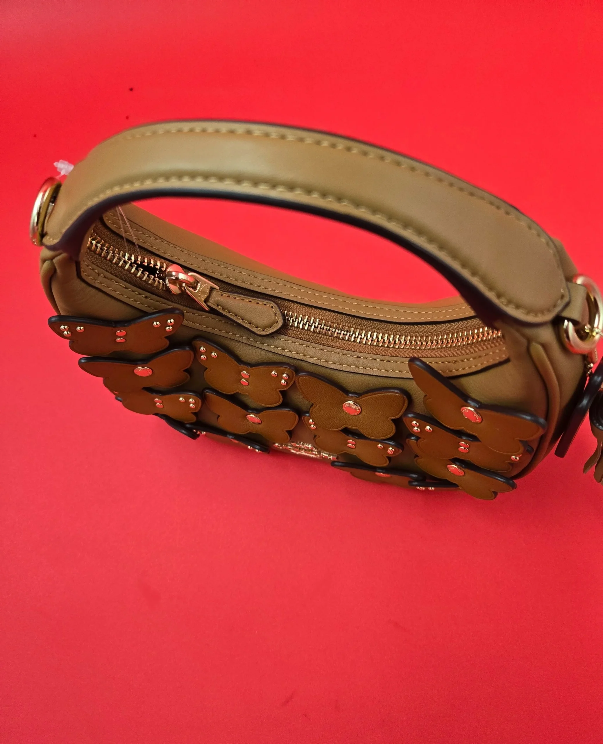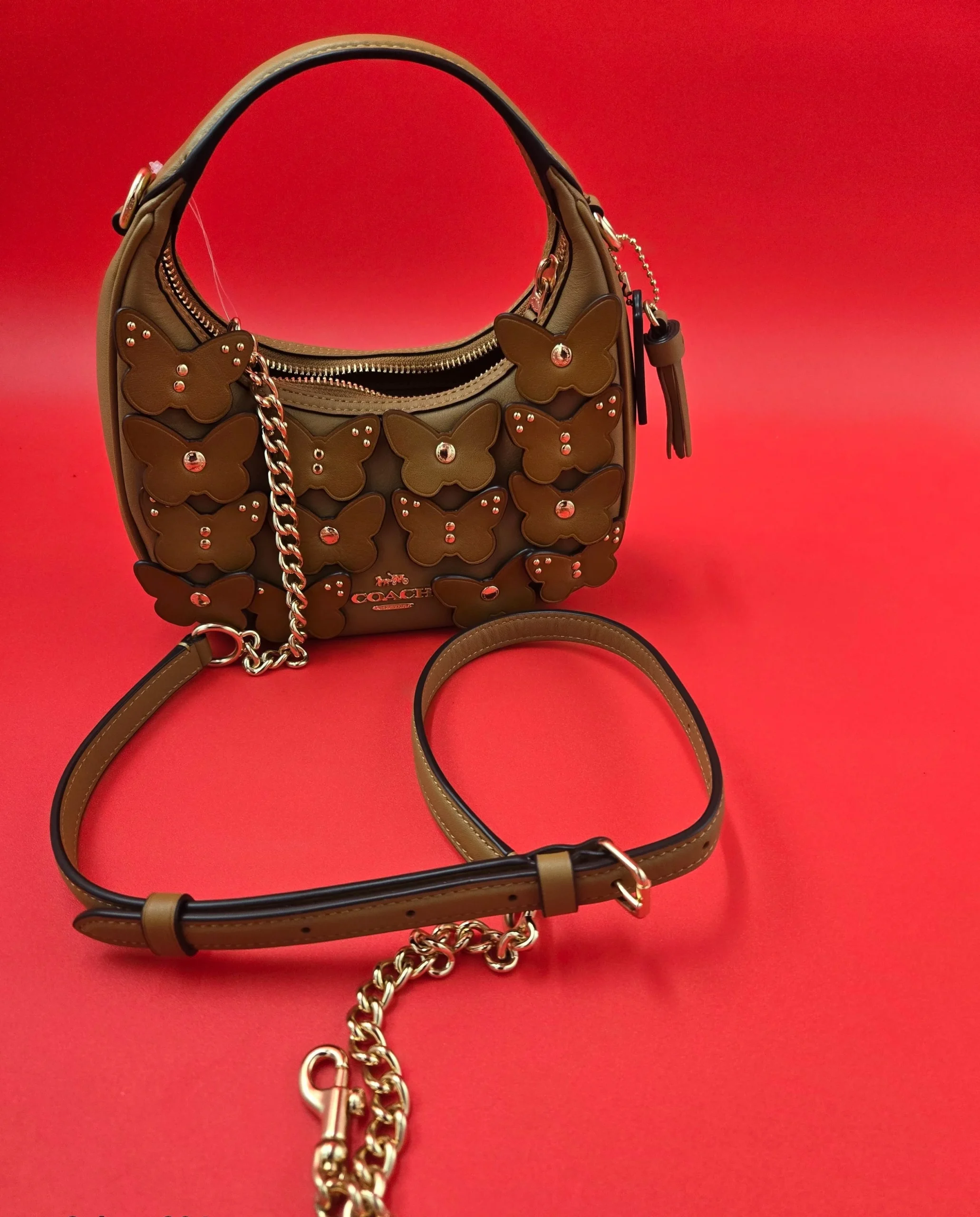 This Coach Mini bag as a unique butterfly gold tone studs design effortlessly style. Features a top handle zipper closure smooth leather detachable gold chain strap crossbody bag 👌 Occasions for all.