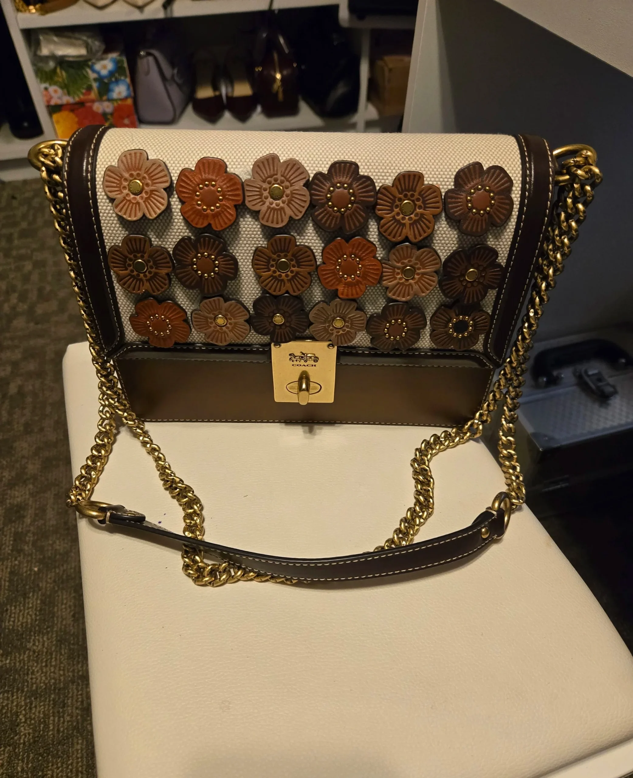 Add a touch of elegance and playful charm to your wardrobe with this stunning Coach shoulder bag. Crafted with refined leather trim and signature canvas, the front is beautifully adorned with layered floral appliqués in warm earthy tones, accented with gold-tone studs for a sophisticated finish. The structured silhouette features a secure turn-lock closure and a gold chain strap with a comfortable leather shoulder detail, allowing you to wear it as a shoulder bag or crossbody. Perfectly sized to carry your essentials, this piece balances fashion and function, making it a timeless addition to any collection.