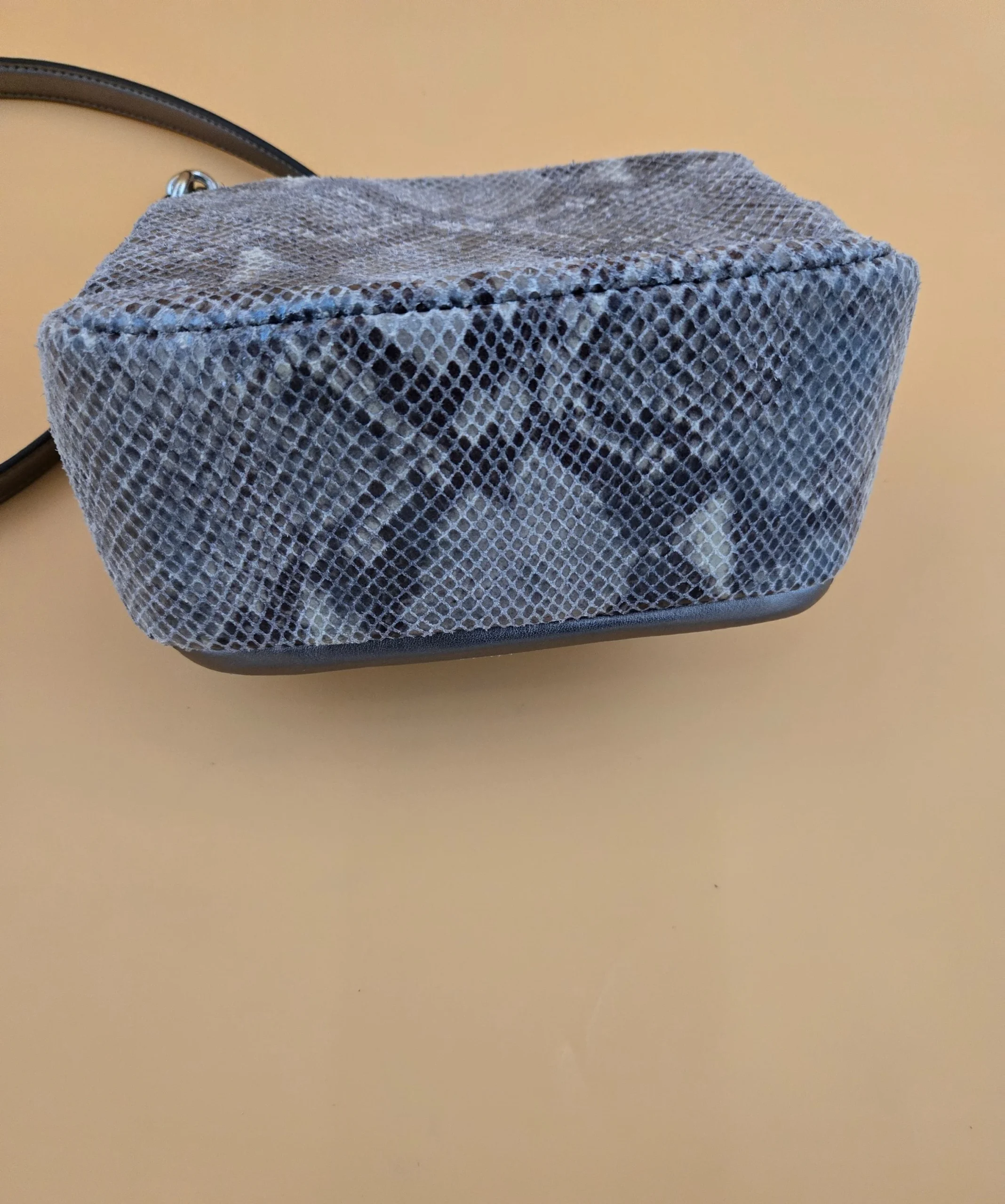 This beautiful Coach Snakeskin print crossbody very versatile, has front pocket with turn key. The exterior of the bag as 2 pocket as we’ll. The bag features top zipper for closure big enough for some essential like phone , keys and other small stuff. The silver hardware is heavy duty , but the bag is light. Cute bag.