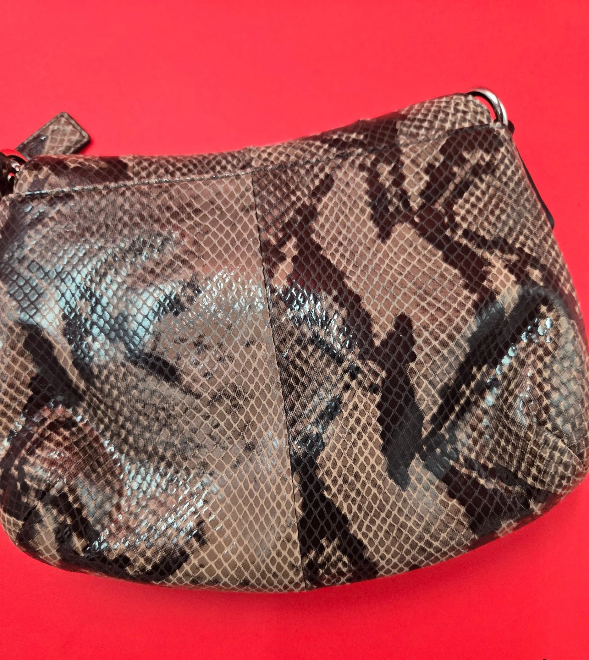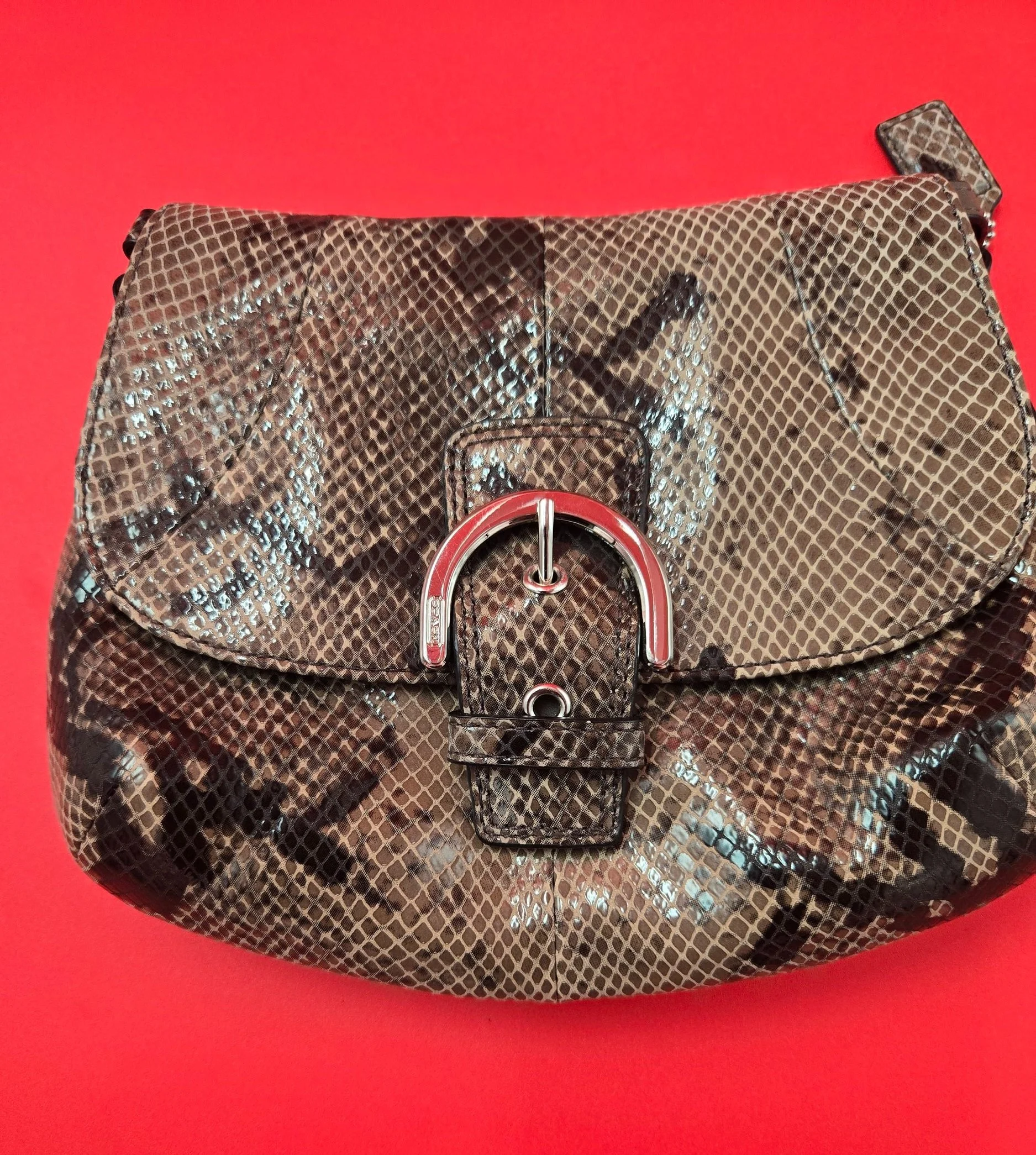 This Snakeskin Python bag features flap closure with snap and silver hardware detail buckle.