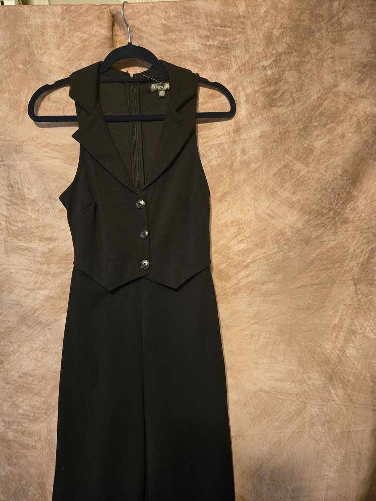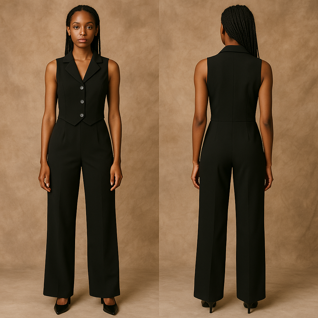 Command the room in this sleek black sleeveless jumpsuit — tailored to perfection with a structured collar, button-up front, and wide-leg silhouette. Whether you’re heading to a business meeting or closing deals in style, this look blends confidence with modern edge. Professional, powerful, and effortlessly chic.