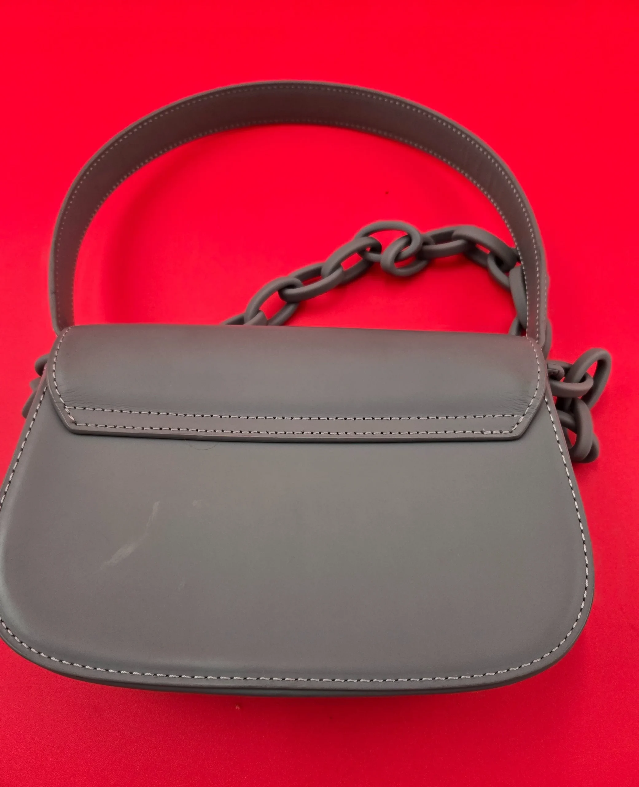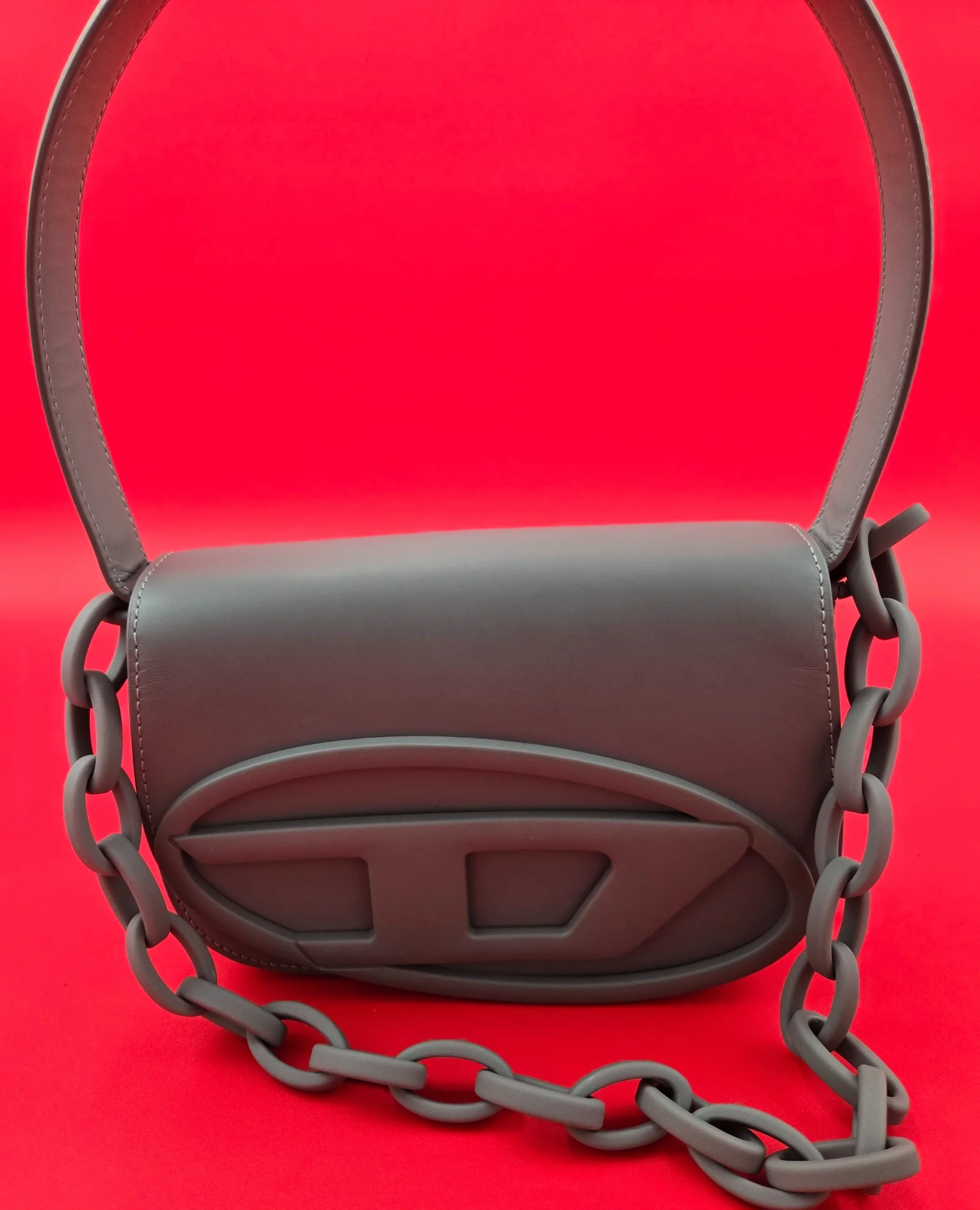 This Diesel bag is a very stylish design it features a magnetic closure complemented by grey hardware accents and solid grey leather with beige canvas lining .