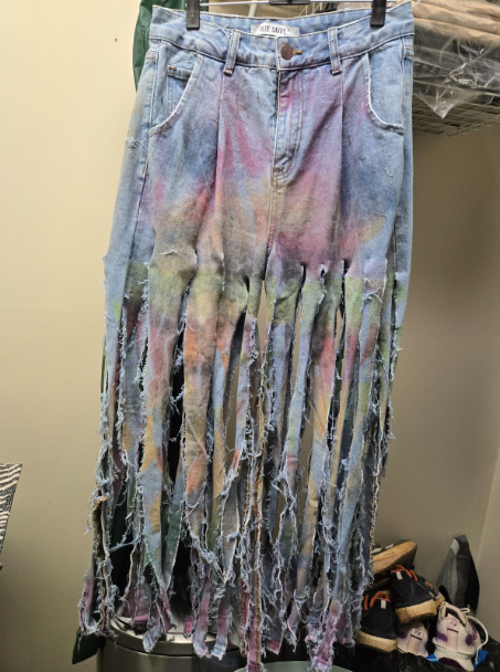These fully shredded denim jeans drip with raw edge energy—cut, torn, and remixed all the way down both legs. Hand-dyed with deep, blended tones that hit different in every light. The fringe moves when you move… loud, rebellious, unforgettable. This is street art you wear.