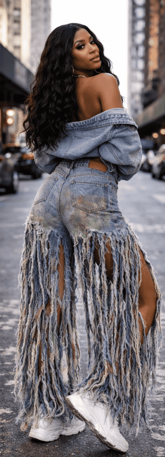 High-waisted remixed denim with multicolor paint and long shredded fringe that moves with every step. Bold, raw, and made to stand out.