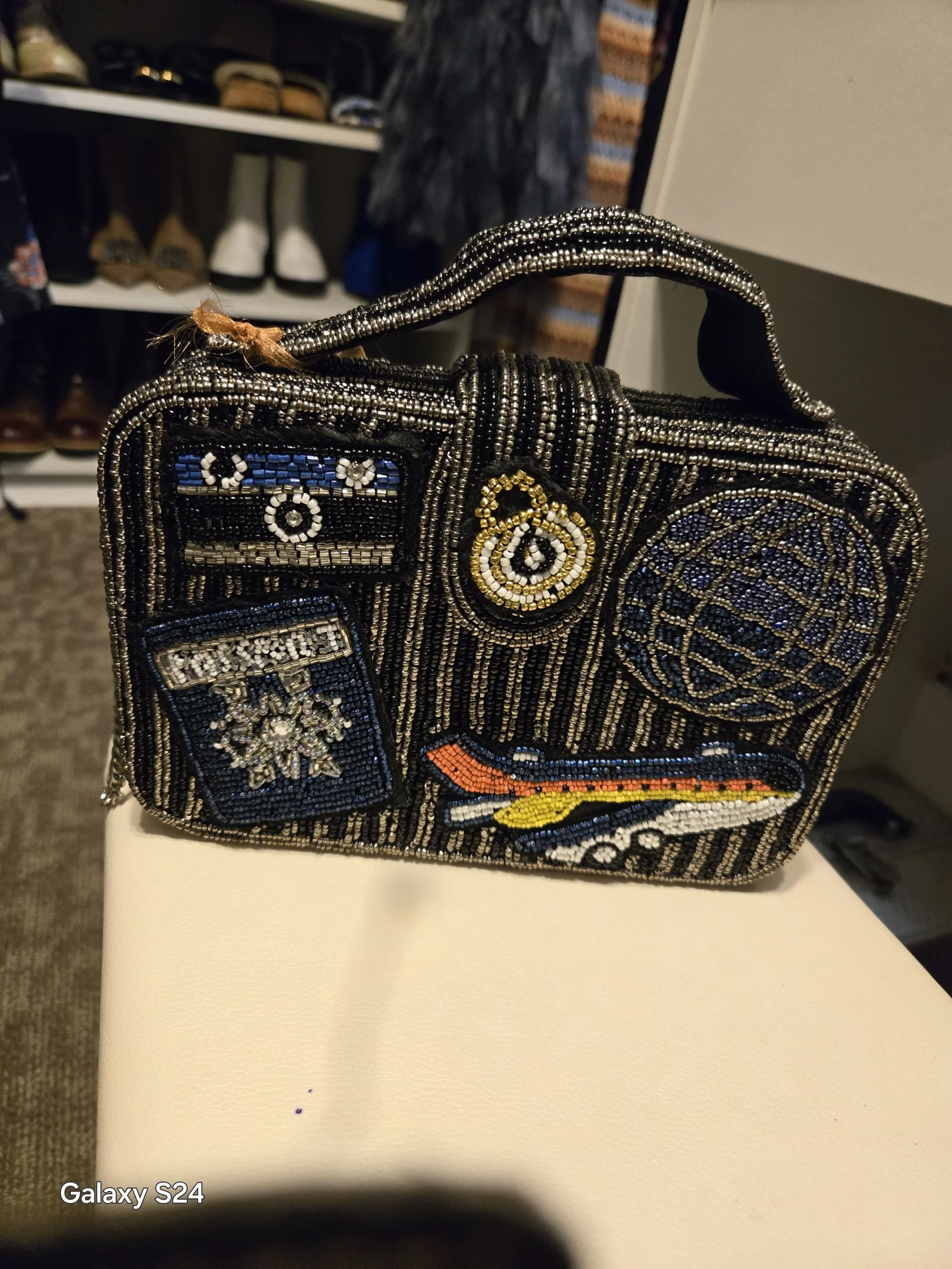 This beaded travel-inspired handbag is more than just an accessory — it’s a conversation starter. Every bead tells a story of adventure, from the sparkling globe that whispers of far-off destinations to the airplane that reminds you to always chase your next journey. Hand-crafted with intricate beadwork, it carries the charm of vintage travel stickers on a modern, chic silhouette. The flat black beaded back adds balance, making it versatile for both statement moments and understated elegance. Whether carried at a New York Fashion Week runway, a night out in the city, or simply displayed on your shelf, this bag exudes wanderlust, sophistication, and individuality.