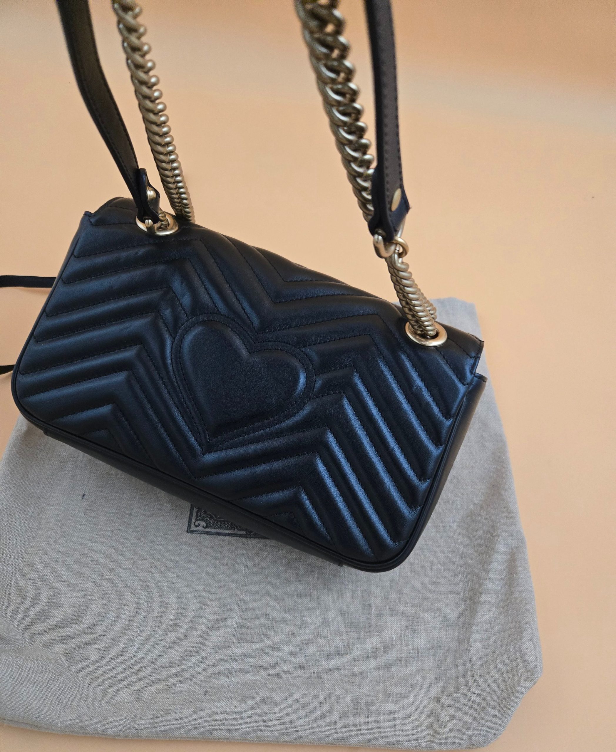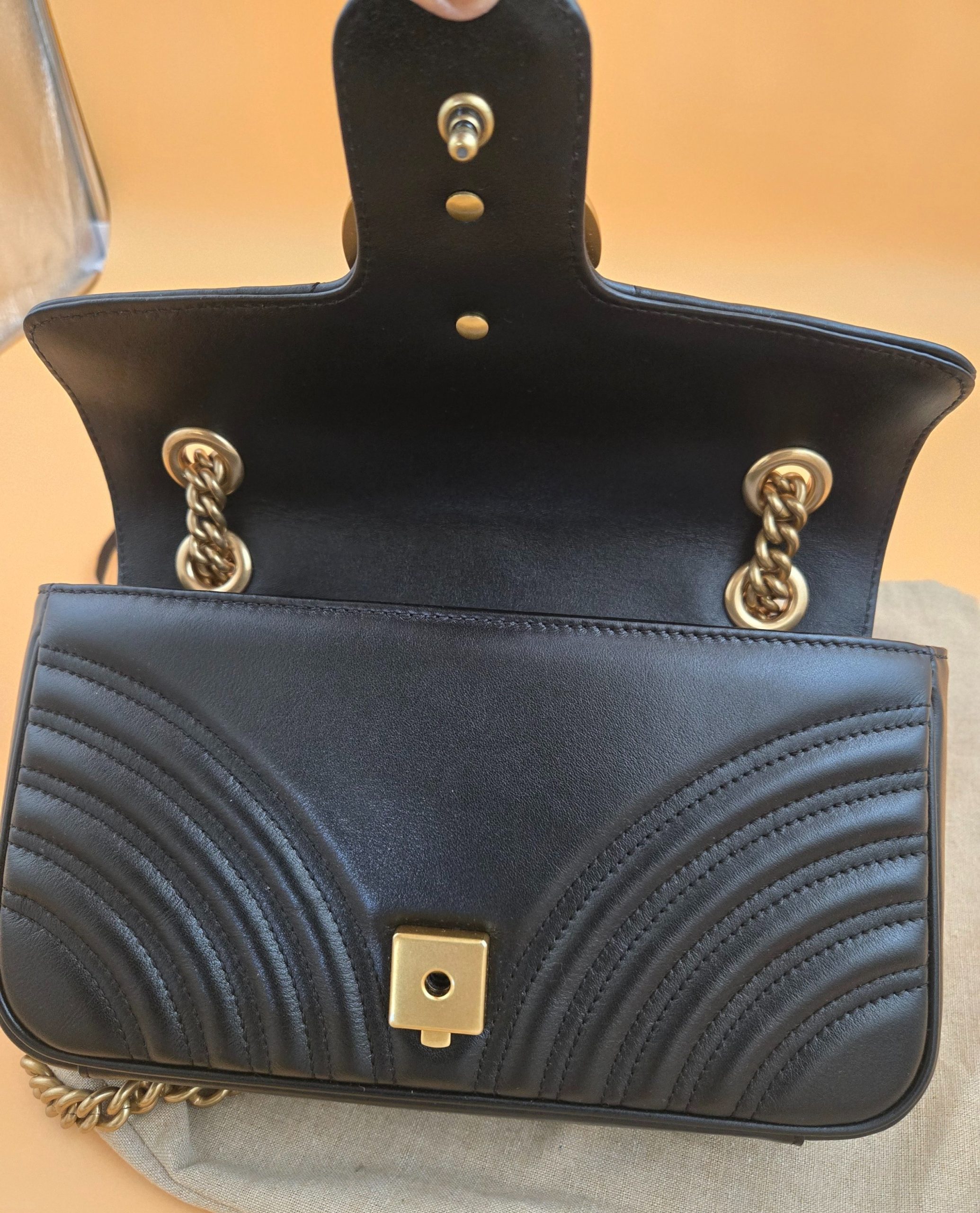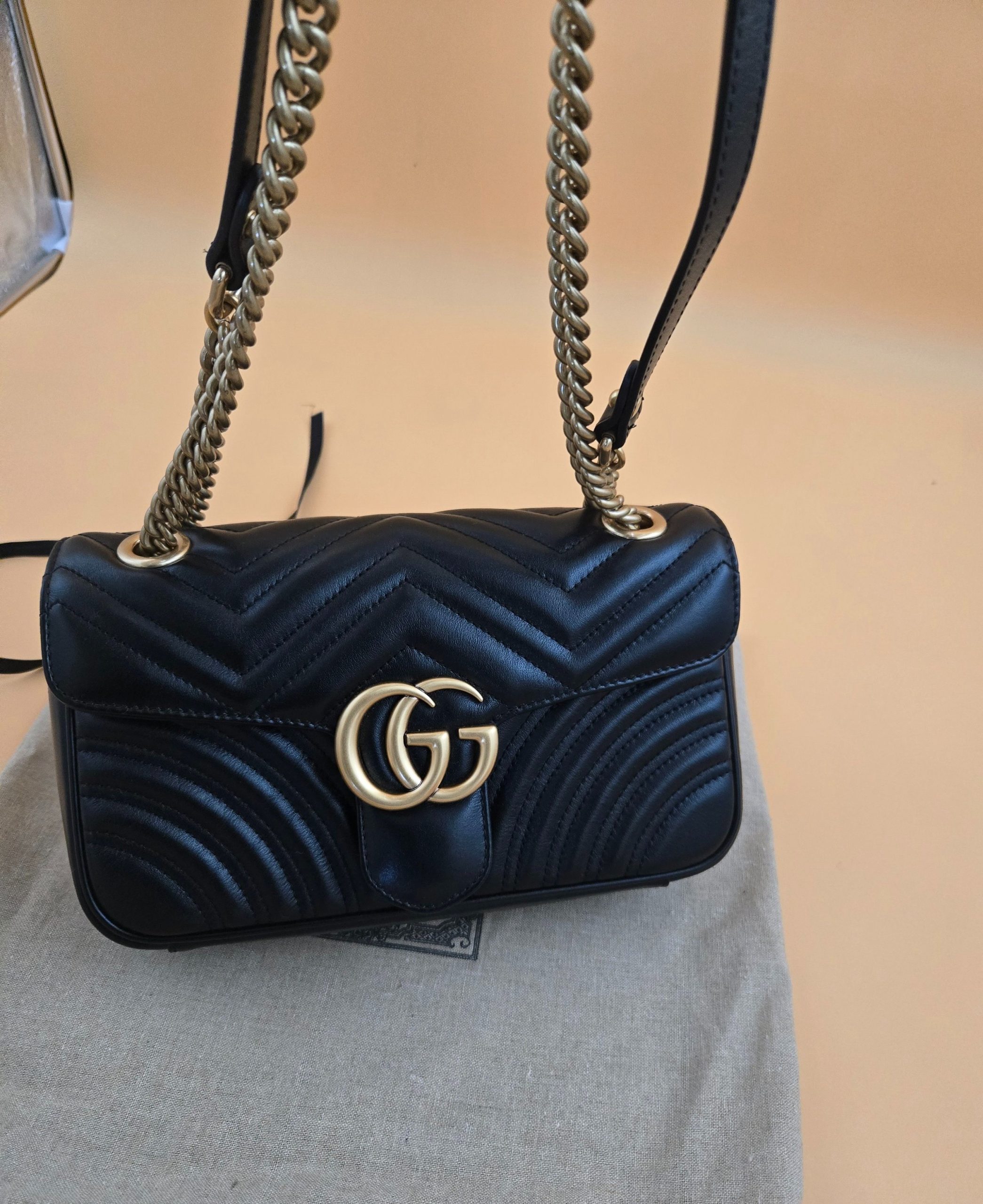 This Gucci GG marmont has soft chevron leather bag with flap closure GG vintage gold tone hardware crossbody gold chain strap bag NWT