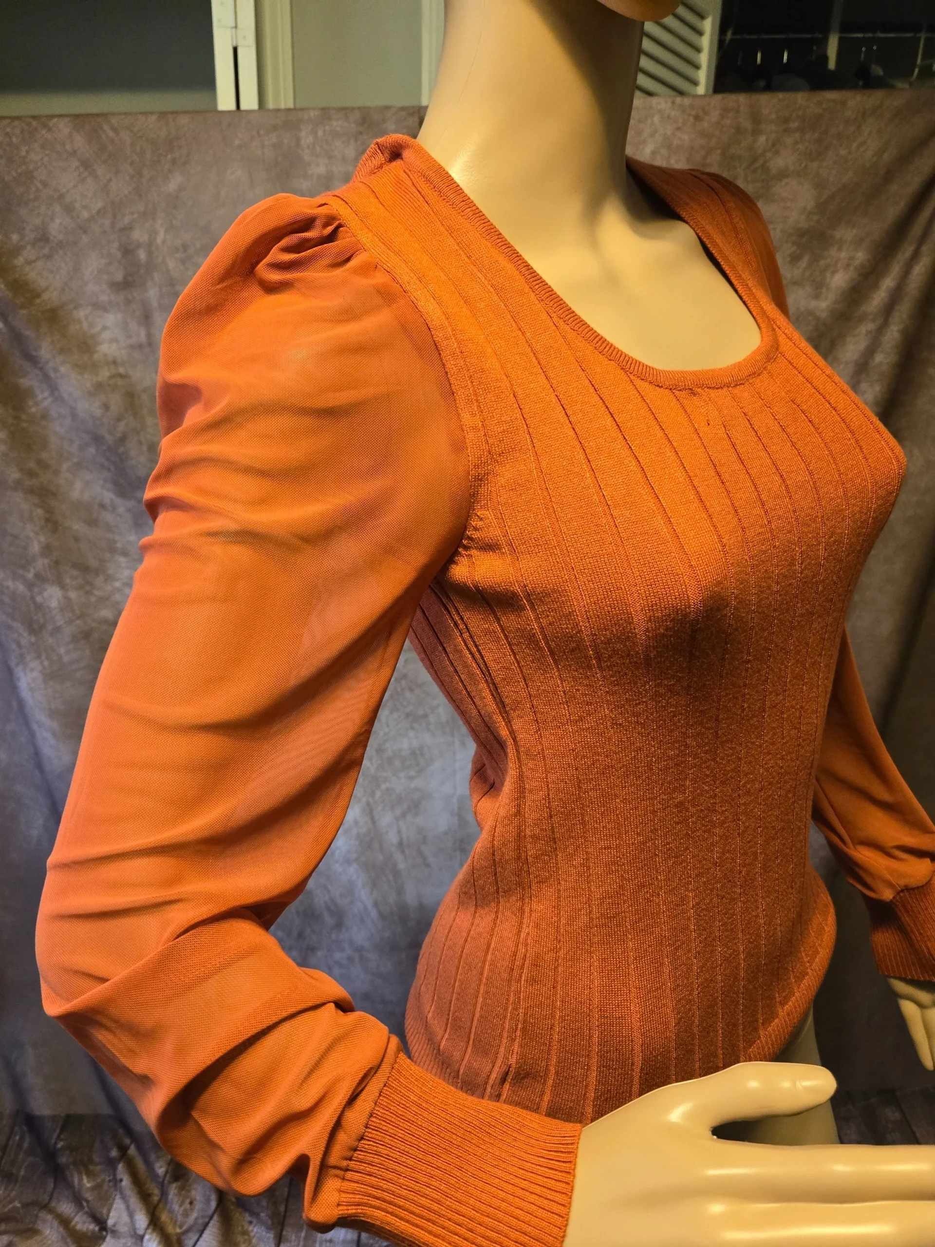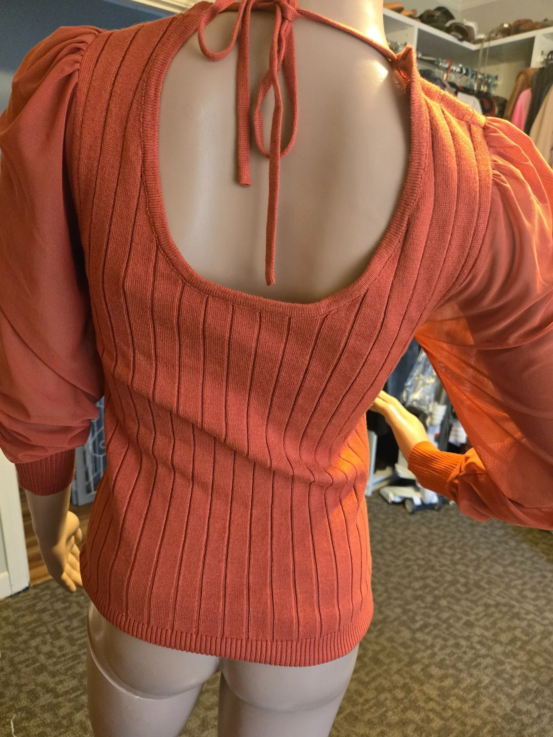 This burnt orange lightweight sweater is the perfect blend of cozy and chic. Featuring sheer long sleeves and a stunning open back with tie detail, it effortlessly transitions from casual daytime vibes to evening elegance. A bold statement piece that hugs the body just right—soft, stylish, and ready to turn heads.