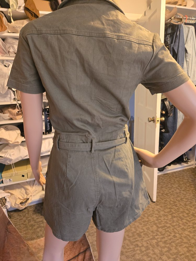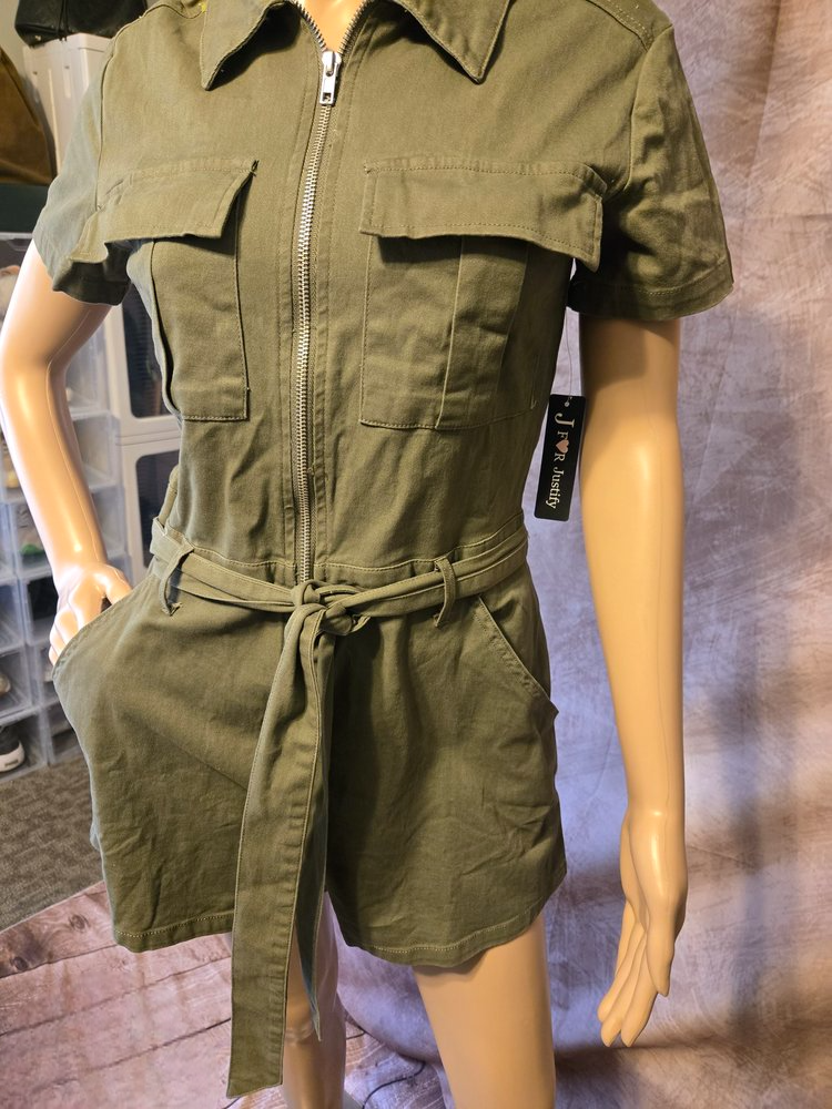 This jumper short is a versatile style suitable for various occasions. Features an expose silver tone zipper front closure a tie belt 2 top pockets 👌 and 2 side pockets short sleeve in collar. color olive green..
