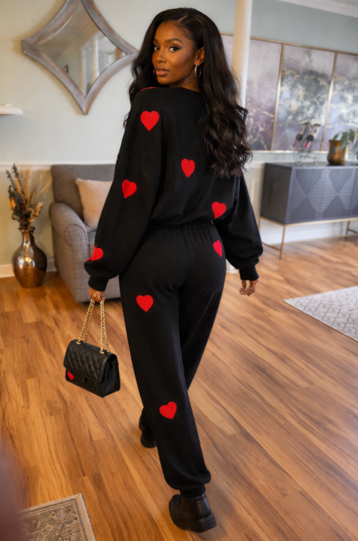 Black two-piece sweatsuit with bold red heart print throughout. Soft pullover top paired with relaxed jogger pants for an easy, comfortable fit. Cozy, playful, and made for everyday wear with just the right amount of edge.
