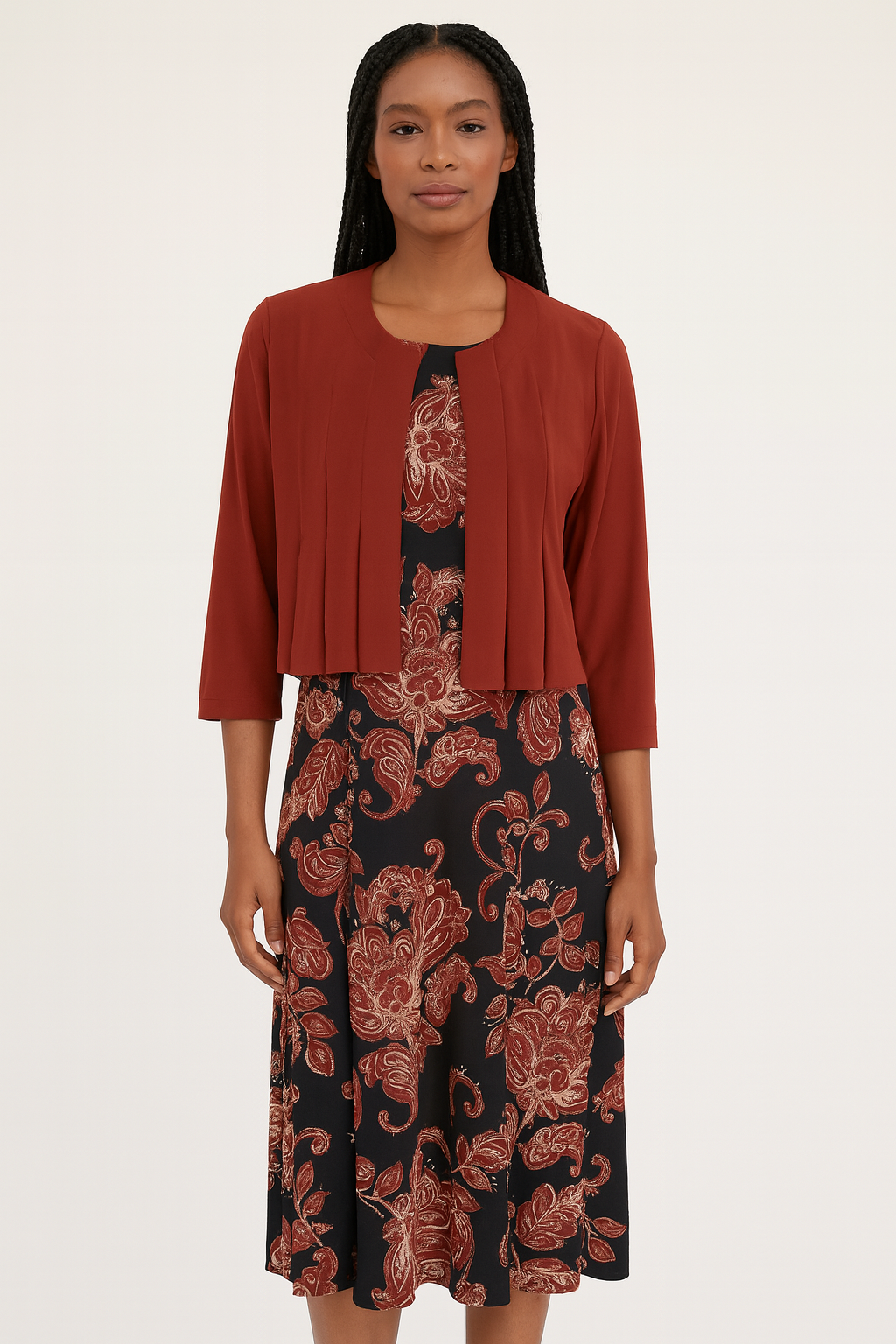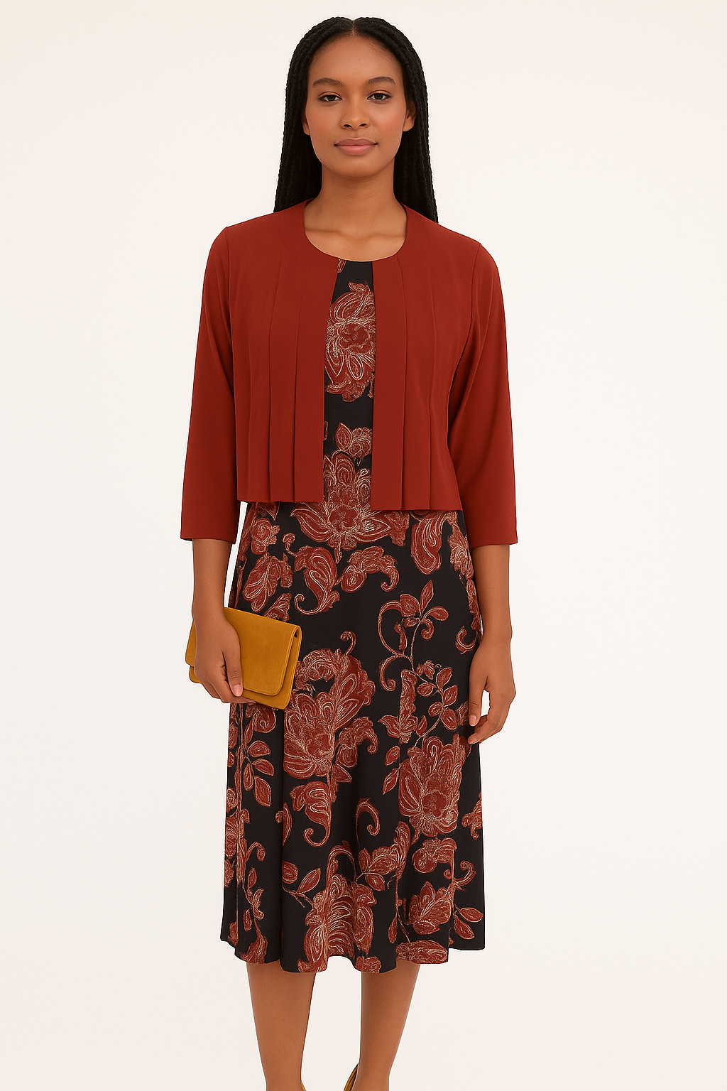 This elegant two-piece set by Julian Taylor βa flowing paisley-print dress paired with a cropped rust-red jacketβoffers endless styling possibilities. One of the easiest ways to refresh the look is by switching up your clutch bag and shoes. Each combination adds a new vibe while keeping the outfit classy and sophisticated. Style Ideas with Clutches: