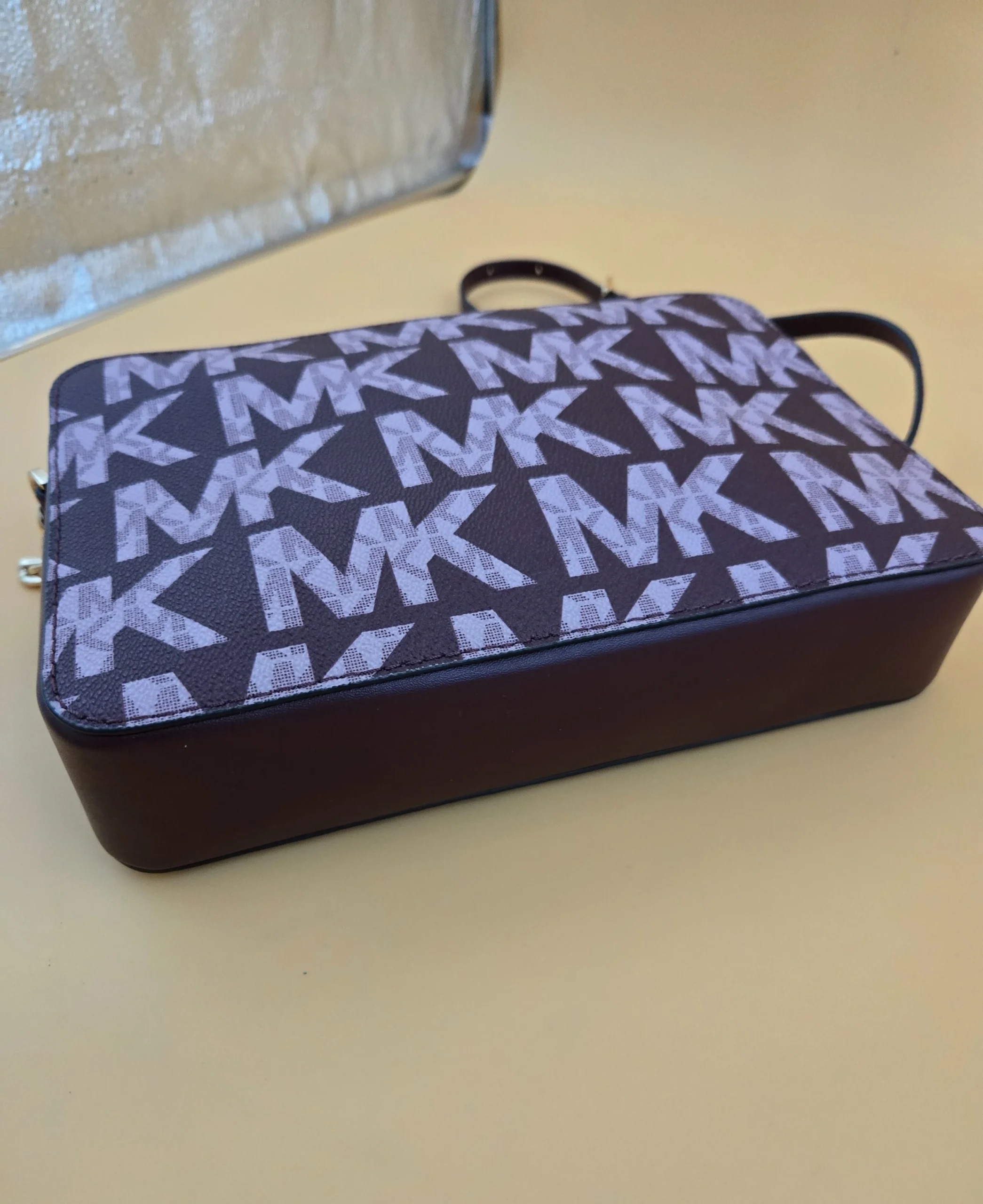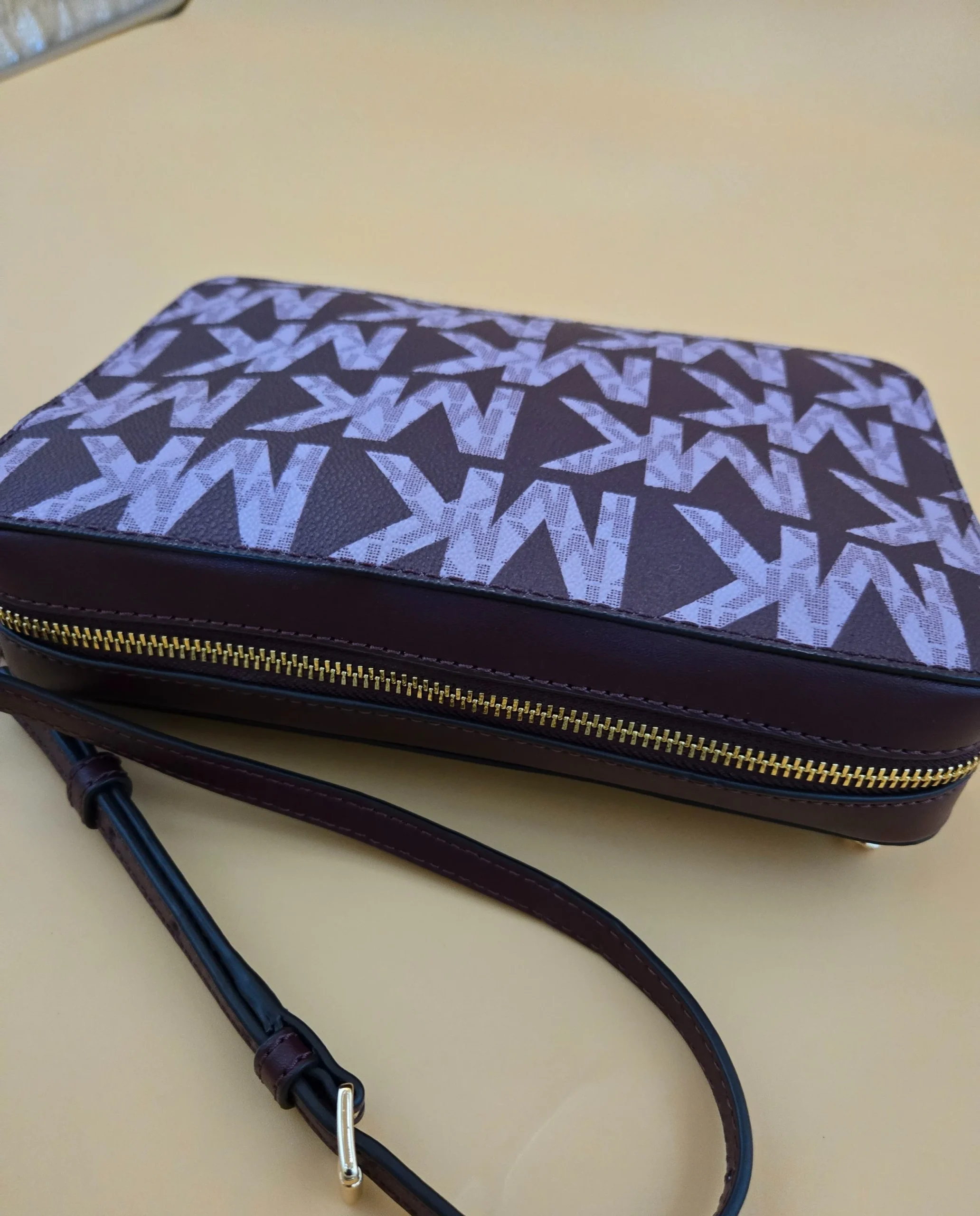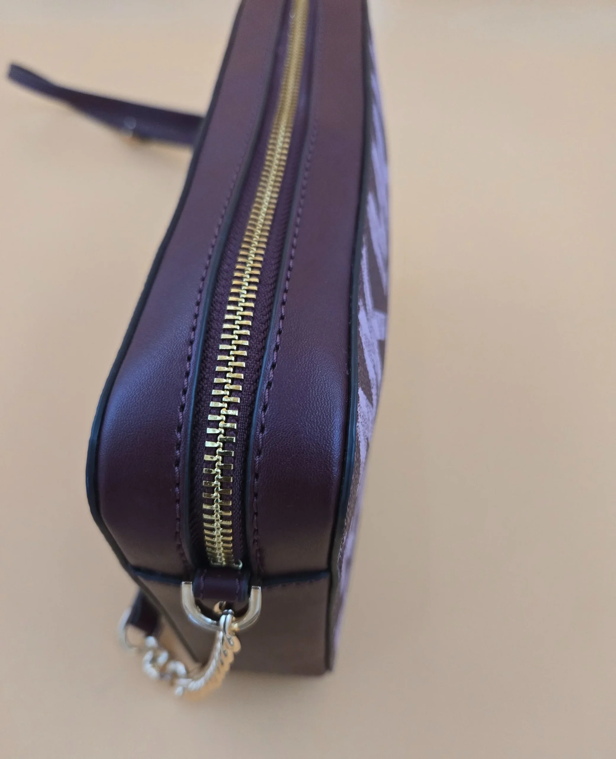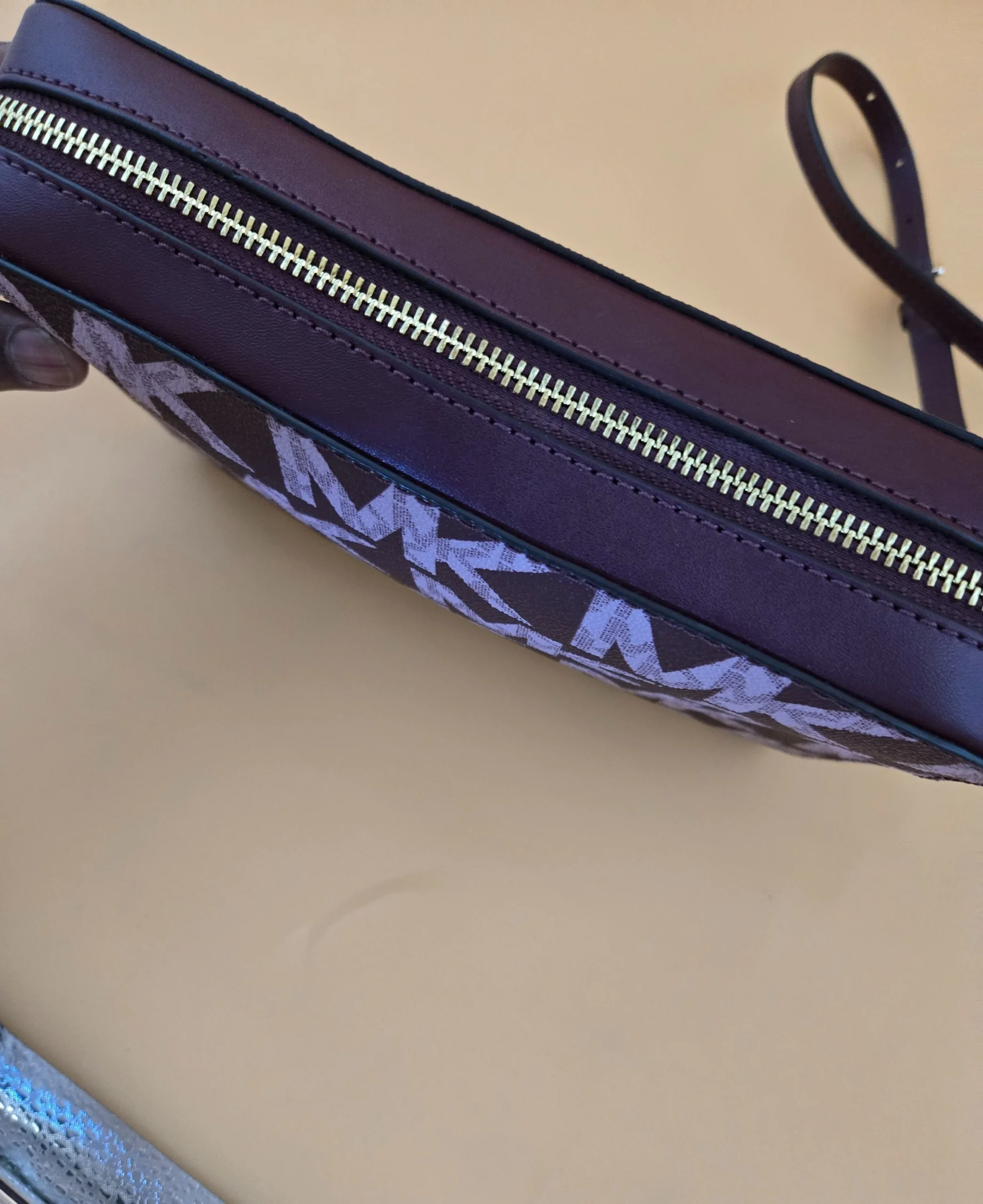 This is a very beautiful Michael Kors bag color burgundy with the iconic logo on a gold tone hardware top gold zipper closure canvas leather ❤️