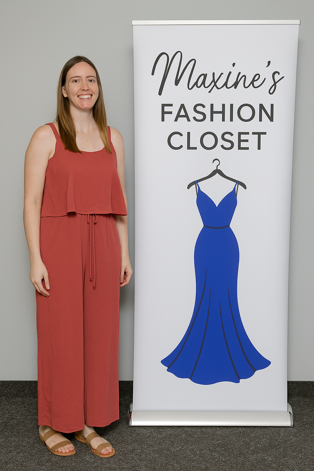 This photo captures a stylish moment at Maxine’s Fashion Closet event. The model is effortlessly chic in a rust-colored wide-leg jumper with a breezy overlay and waist tie, perfectly complementing the boutique’s elegant branding. Standing beside the Maxine’s Fashion Closet banner, she embodies the modern, confident woman the brand celebrates—fashion-forward, relaxed, and ready to shine.