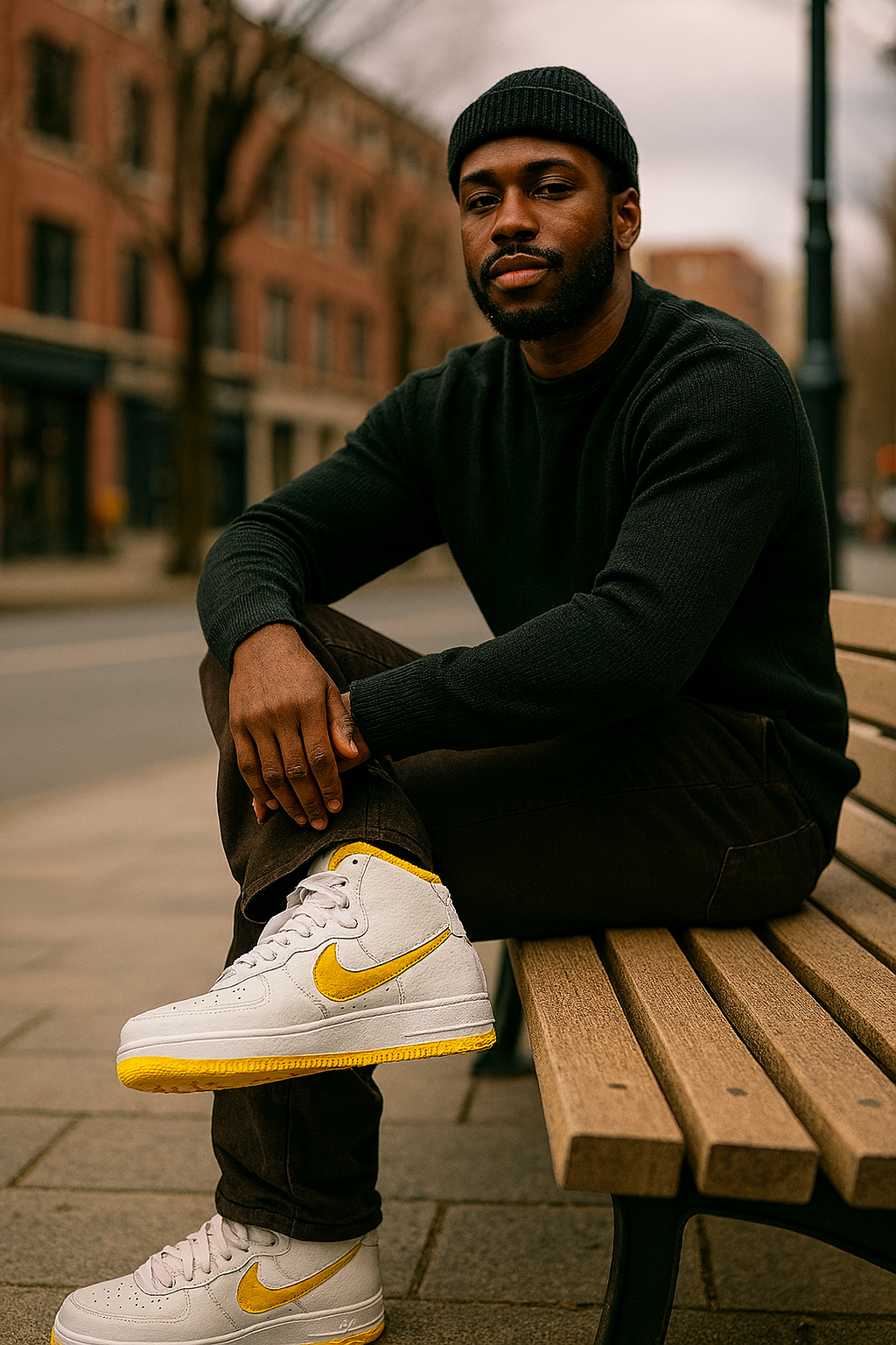This image captures effortless urban style—clean, confident, and fresh. The black male model sits poised on a sleek bench, one leg up, showing off his white and yellow Nike Air Force 1s. The beige sweatsuit adds a relaxed, neutral tone, allowing the bold sneakers to pop. It’s the perfect blend of streetwear cool and everyday comfort—where chill meets standout.