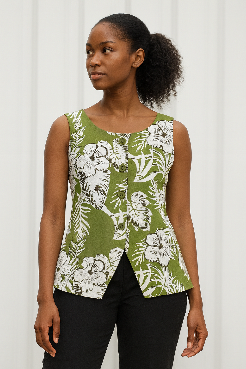 Tropical Breeze Button-Down Blouse Bring a touch of island charm to your wardrobe with this sleeveless green blouse, featuring bold white hibiscus and palm leaf prints. The button-down front and soft flowy cut make it both flattering and comfortable, perfect for sunny days, brunch dates, or casual outings. Style it with jeans for a relaxed look, or pair it with crisp white trousers and sandals for a chic summer vibes.