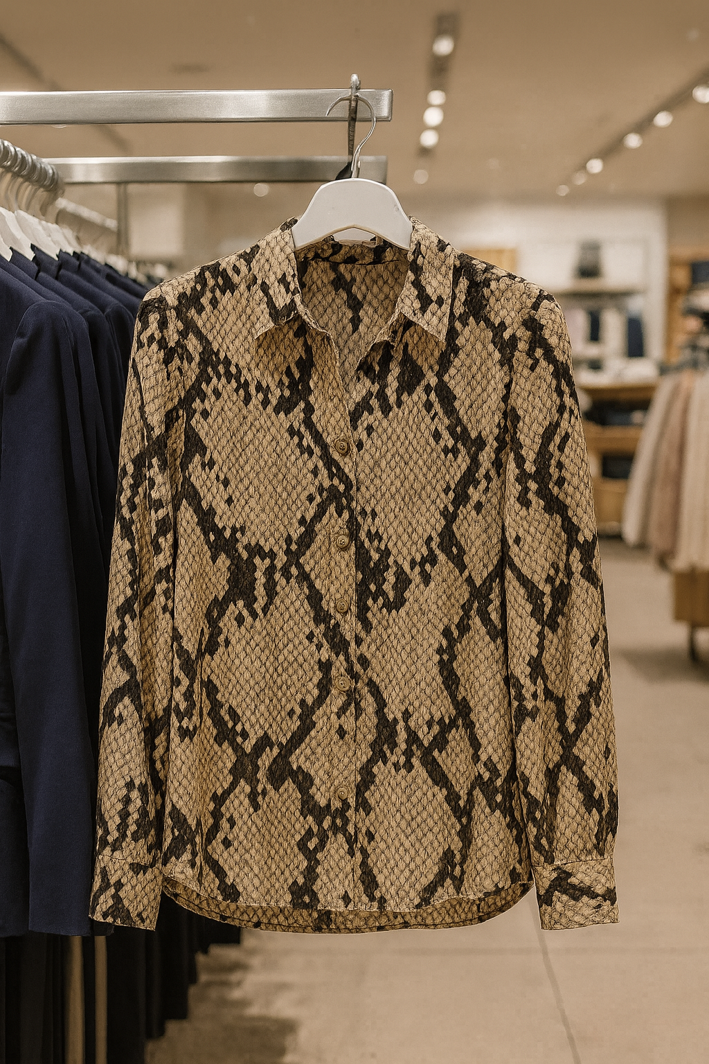 Chic and bold, this snake-print blouse adds a touch of fierce sophistication to any wardrobe. Featuring a classic button-down design and timeless collar, it’s the perfect statement piece for work or weekend style.””Chic and bold, this snake-print blouse adds a touch of fierce sophistication to any wardrobe. Featuring a classic button-down design and timeless collar, it’s the perfect statement piece for work or weekend style