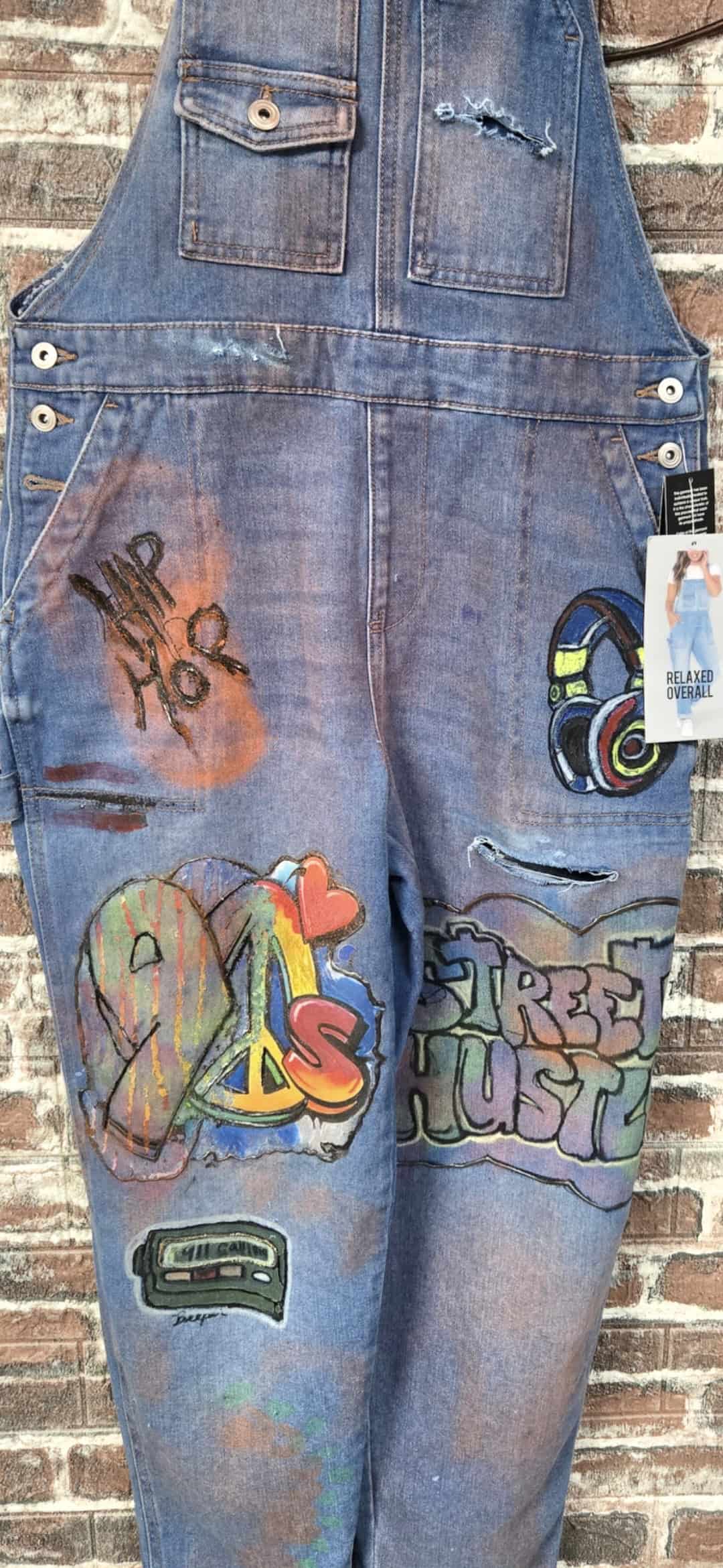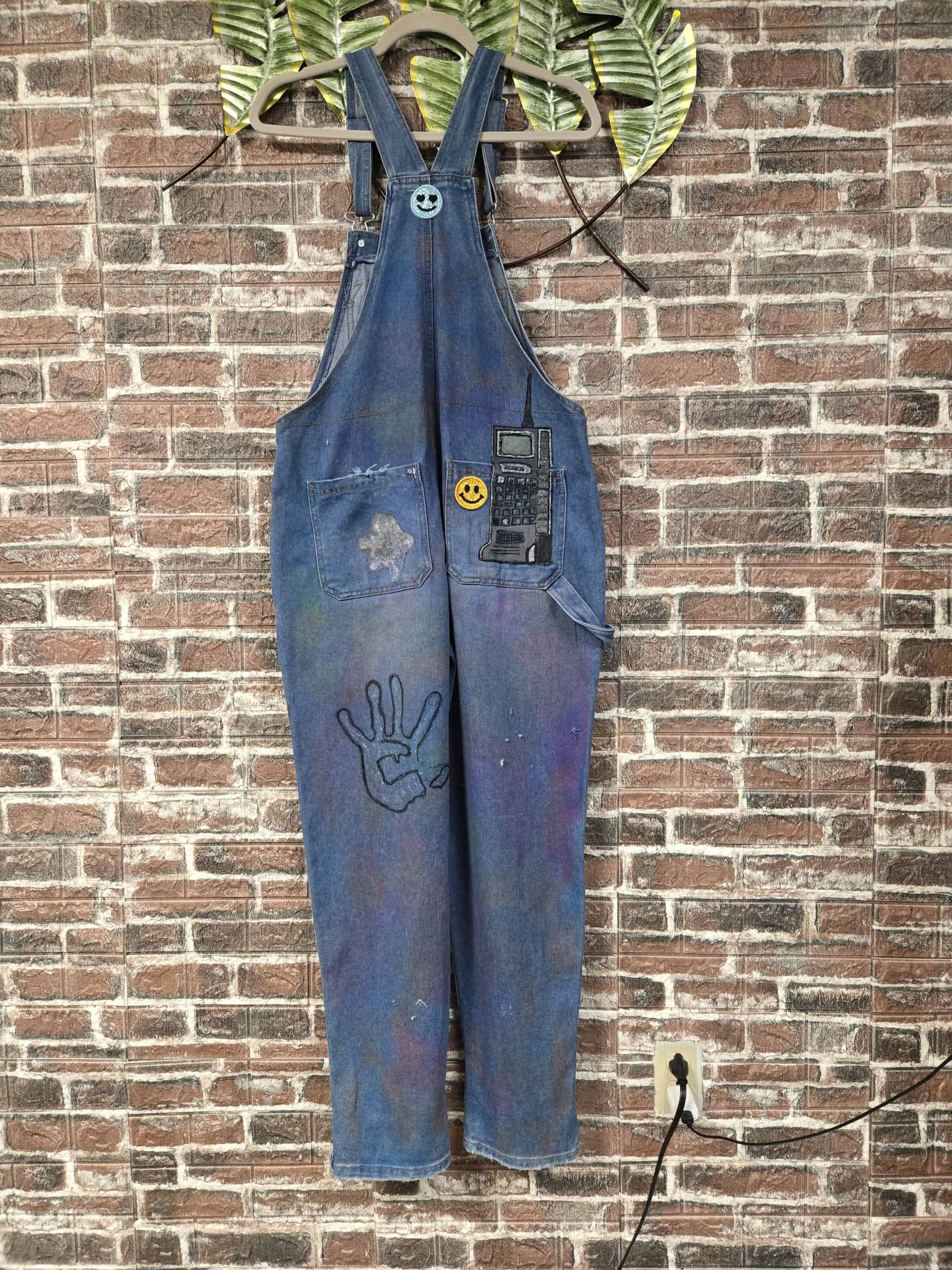 Hand-remixed denim overalls with that raw 90s energy—spray hits, handprints, peace vibes, and street storytelling all stitched in. The headphone detail rides the pocket, the beeper hits the back like a throwback signal—every piece placed with purpose, not by accident.