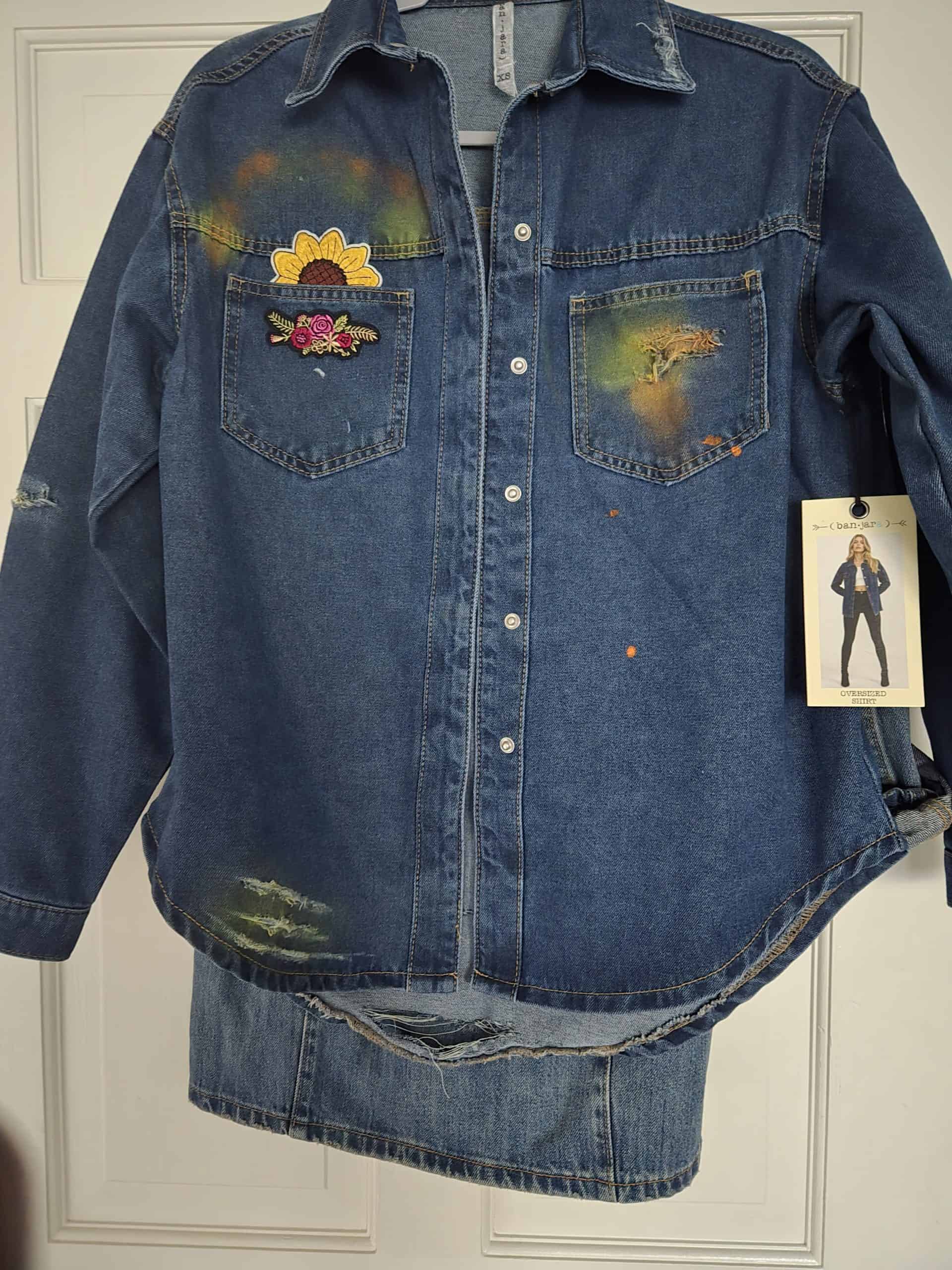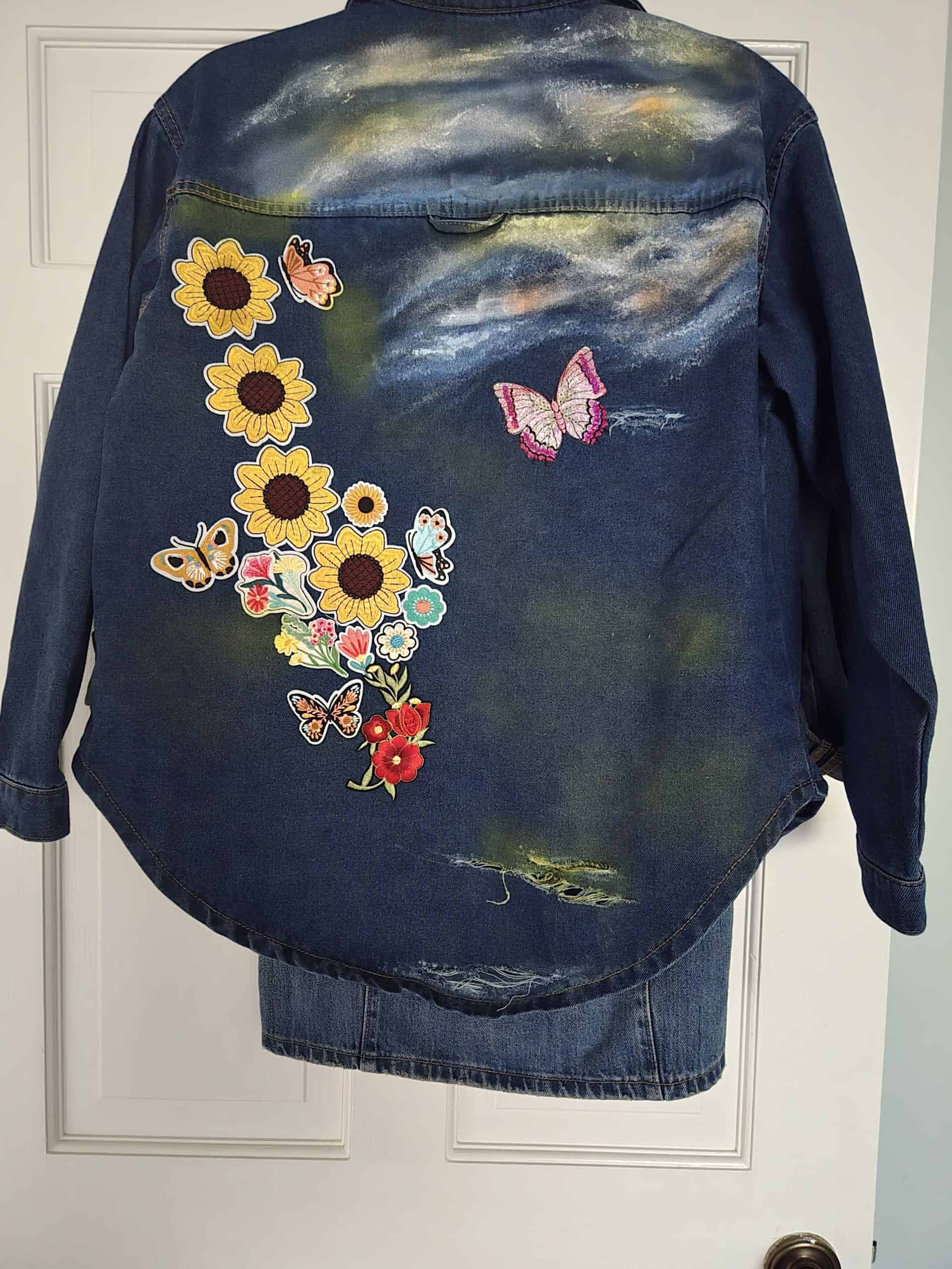 Maxine Remix Classic denim shirt turned into a walking canvas. Front keeps it calm with soft distress and small accents… then the back blooms heavy—sunflowers, butterflies, color dripping like it grew there. It’s that balance—quiet in the front, story in the back.