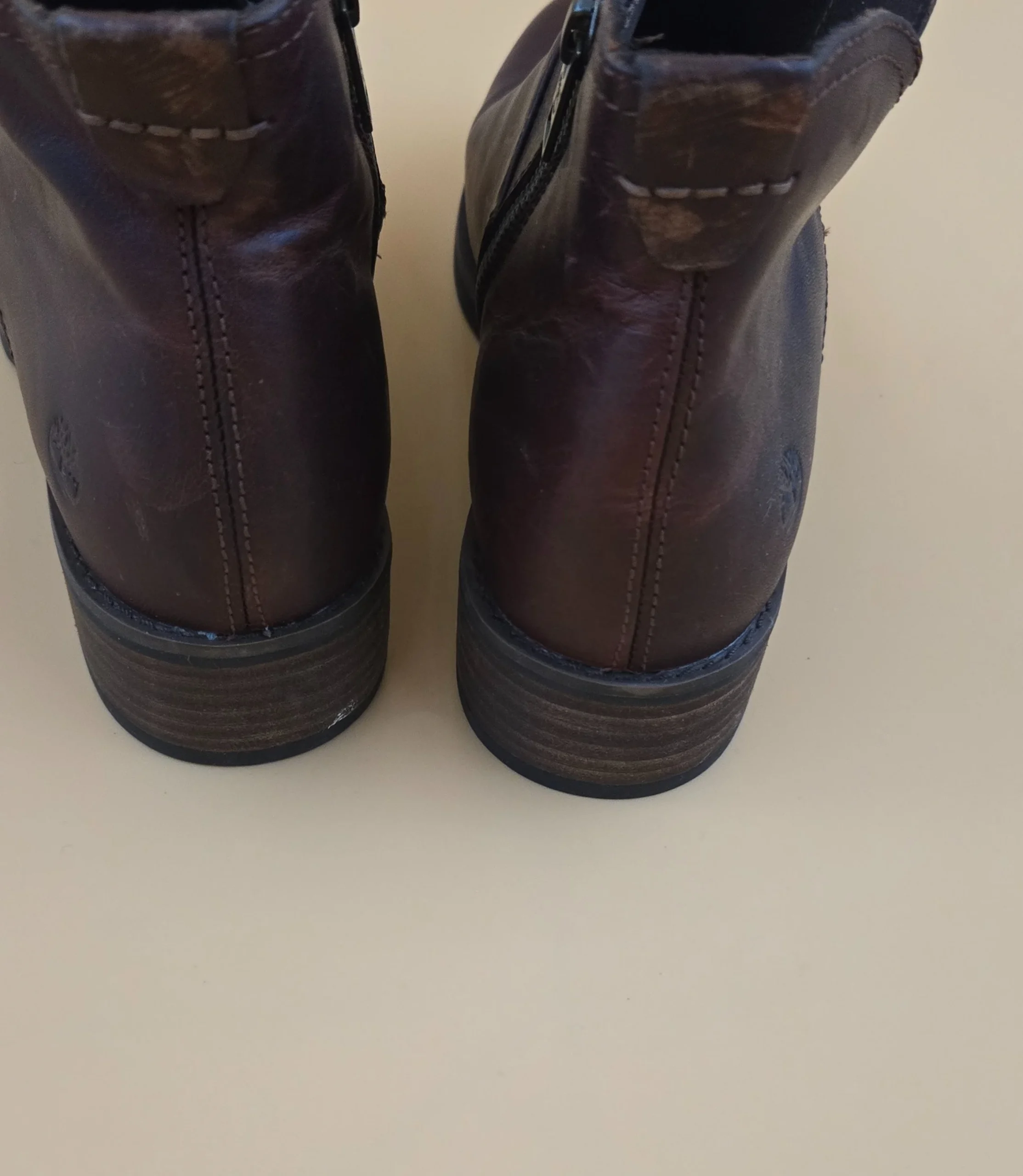 Timberland boots strong 💪 leather slip on side zipper closure. The markin on this boots that is the style. That’s the way it was bought. This timberland ankle boots will last you forever. Wear any seasons.