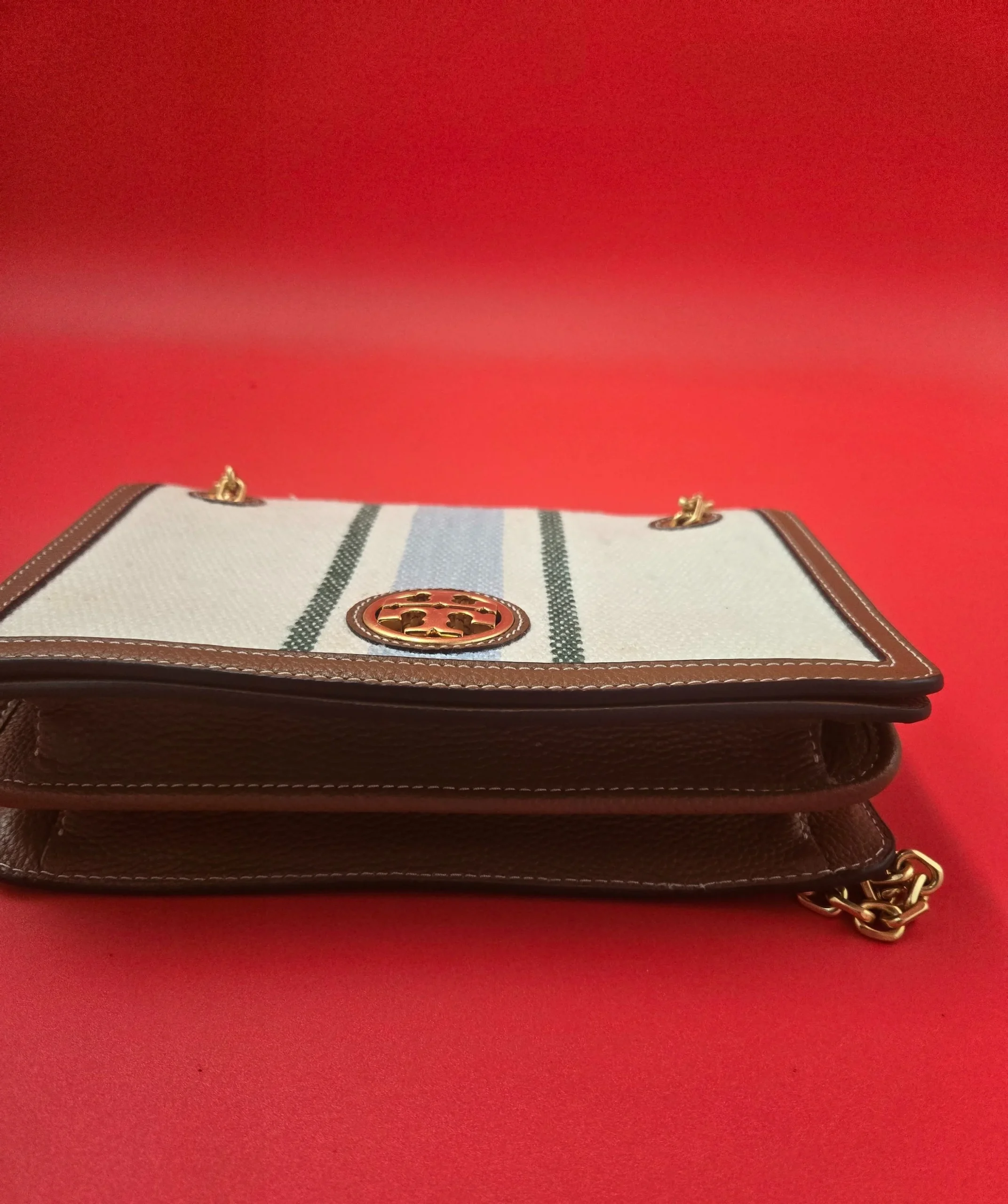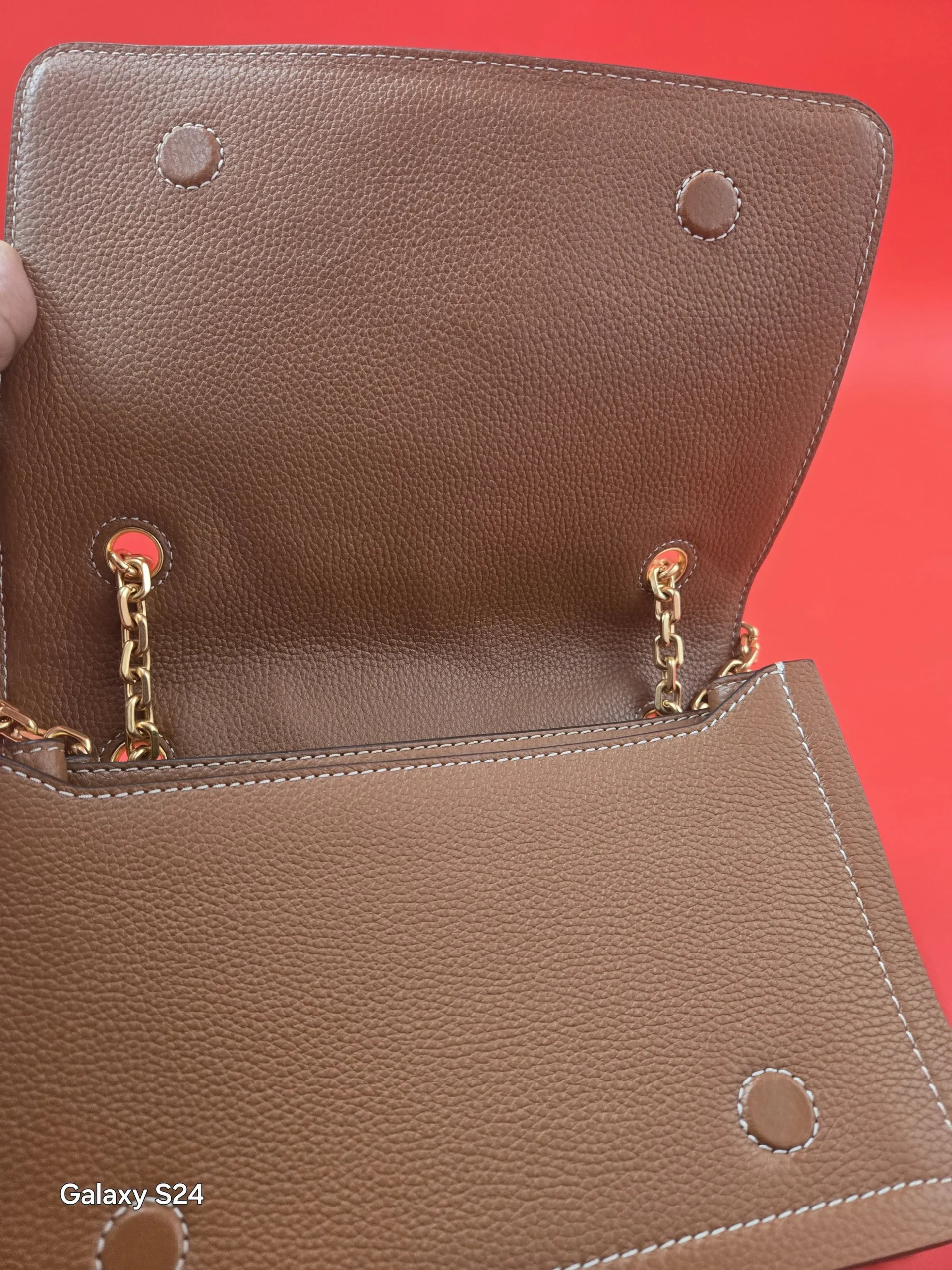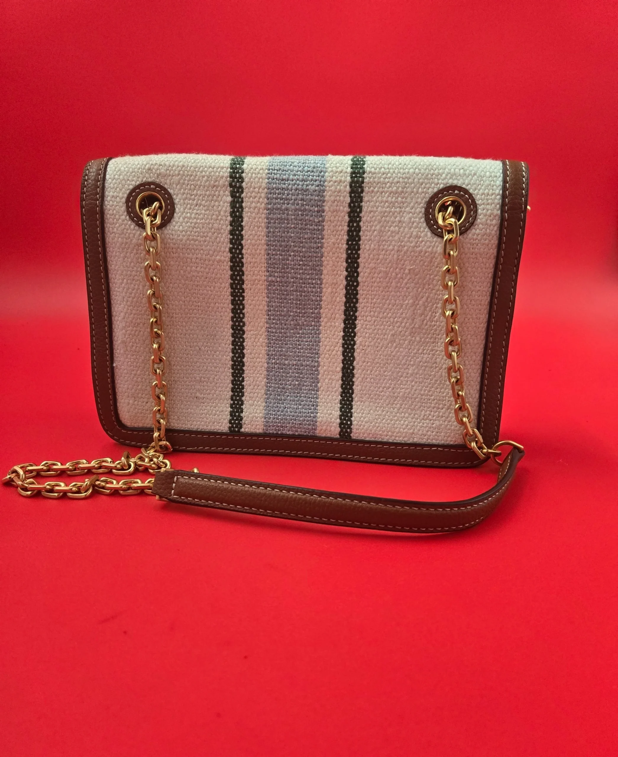 This beautiful purse features gold tone chain strap with leather top handle flap front snap closure. The exquisite design shows off sophistication showcasing the iconic logo gold tone hardware detail on the front 👌. Excellent quality condition .