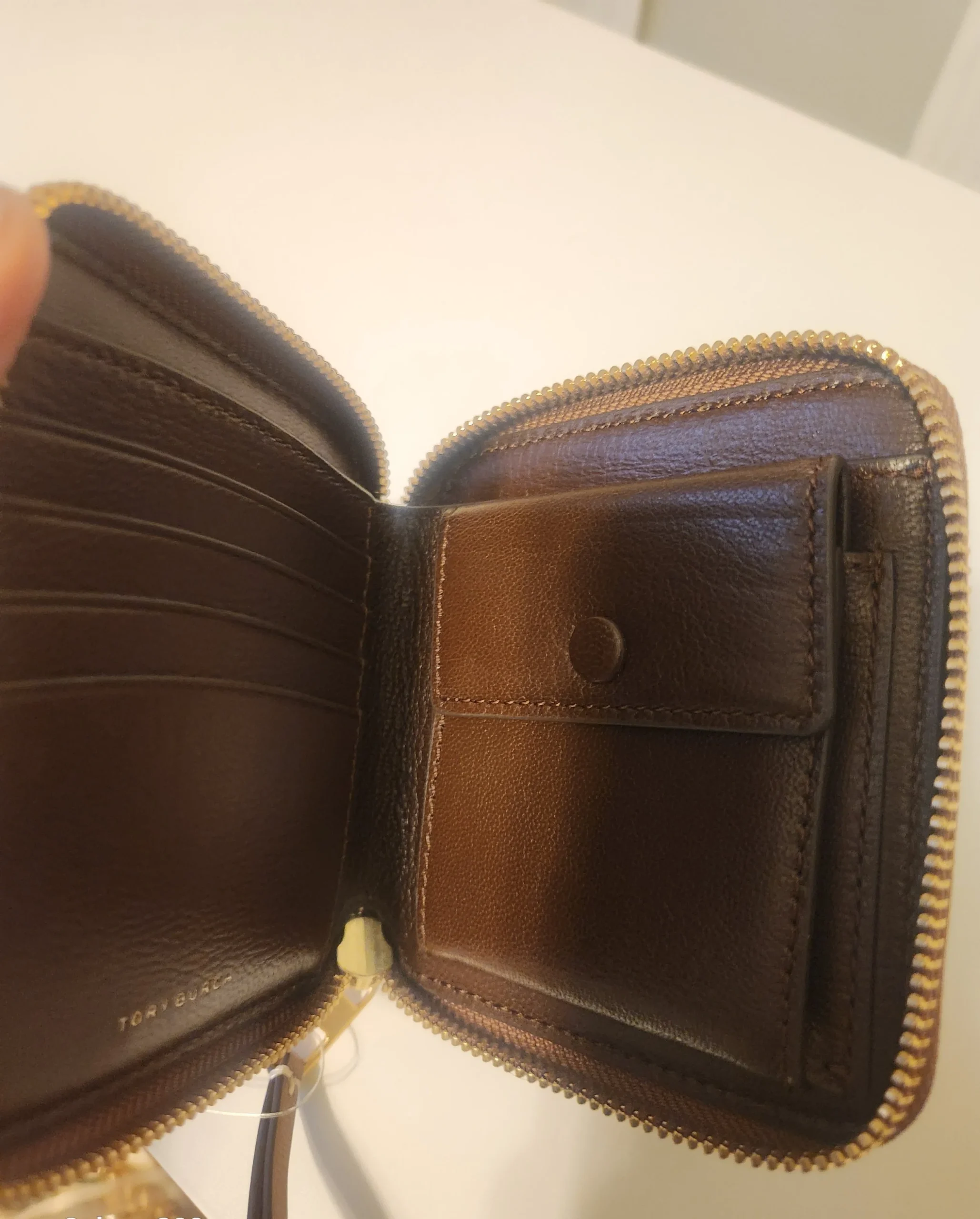 This Tory Burch leather Bifold as the gold tone iconic logo 0n the front zipper closure 1 inner snap closure coin pocket and 4 card slots bills pocket inside. Color Moose.