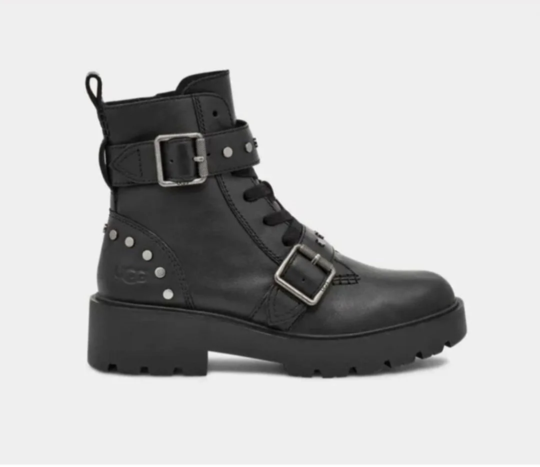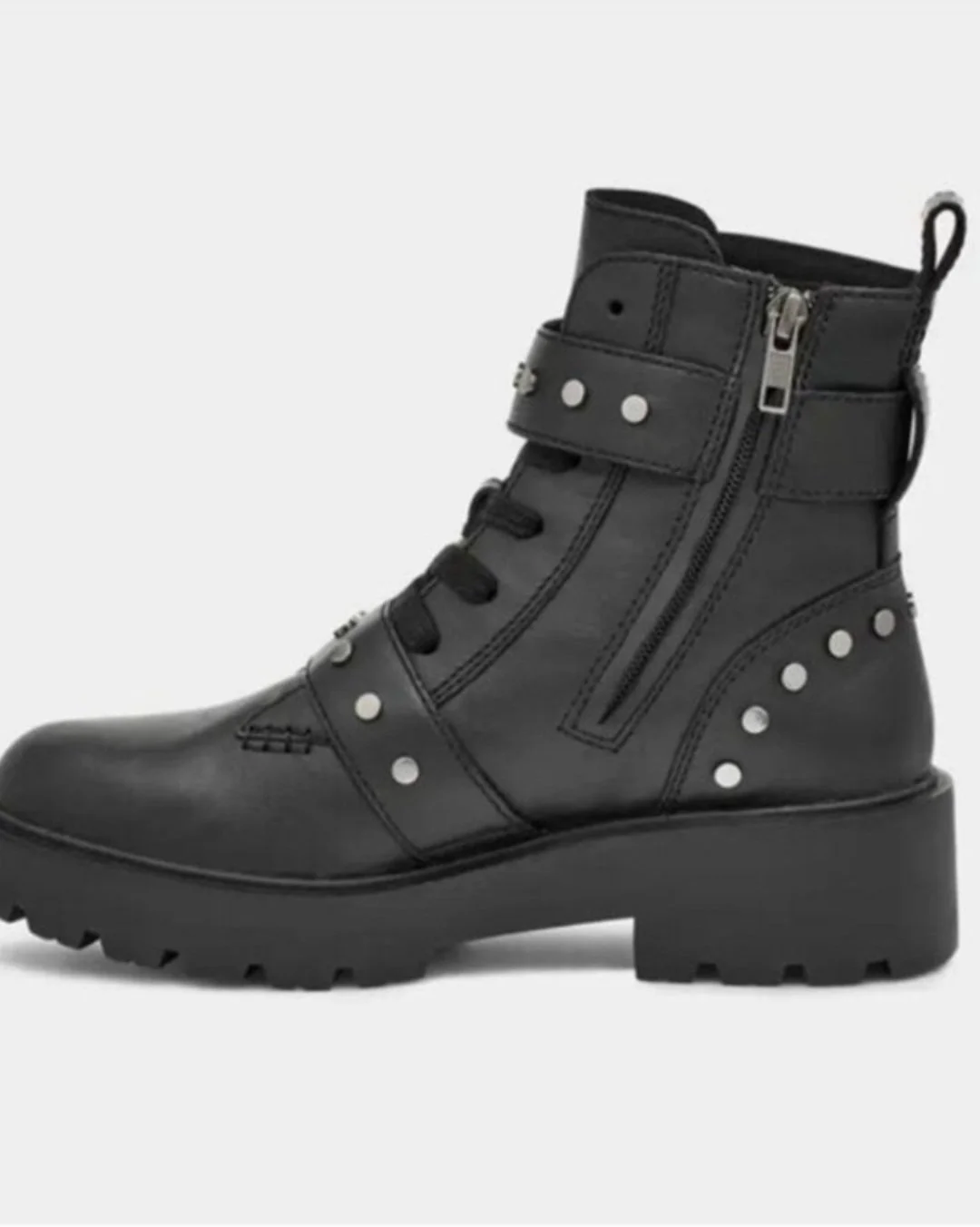 Zorrah studs leather black boots buckle strap . The features Upper Leather silver metal studs and buckled embossed UGG logo on the side of boots . Side zipper for closure and lace up front can also use as closure. Durable rubber outsole not a heavy boots wear it any seasons.