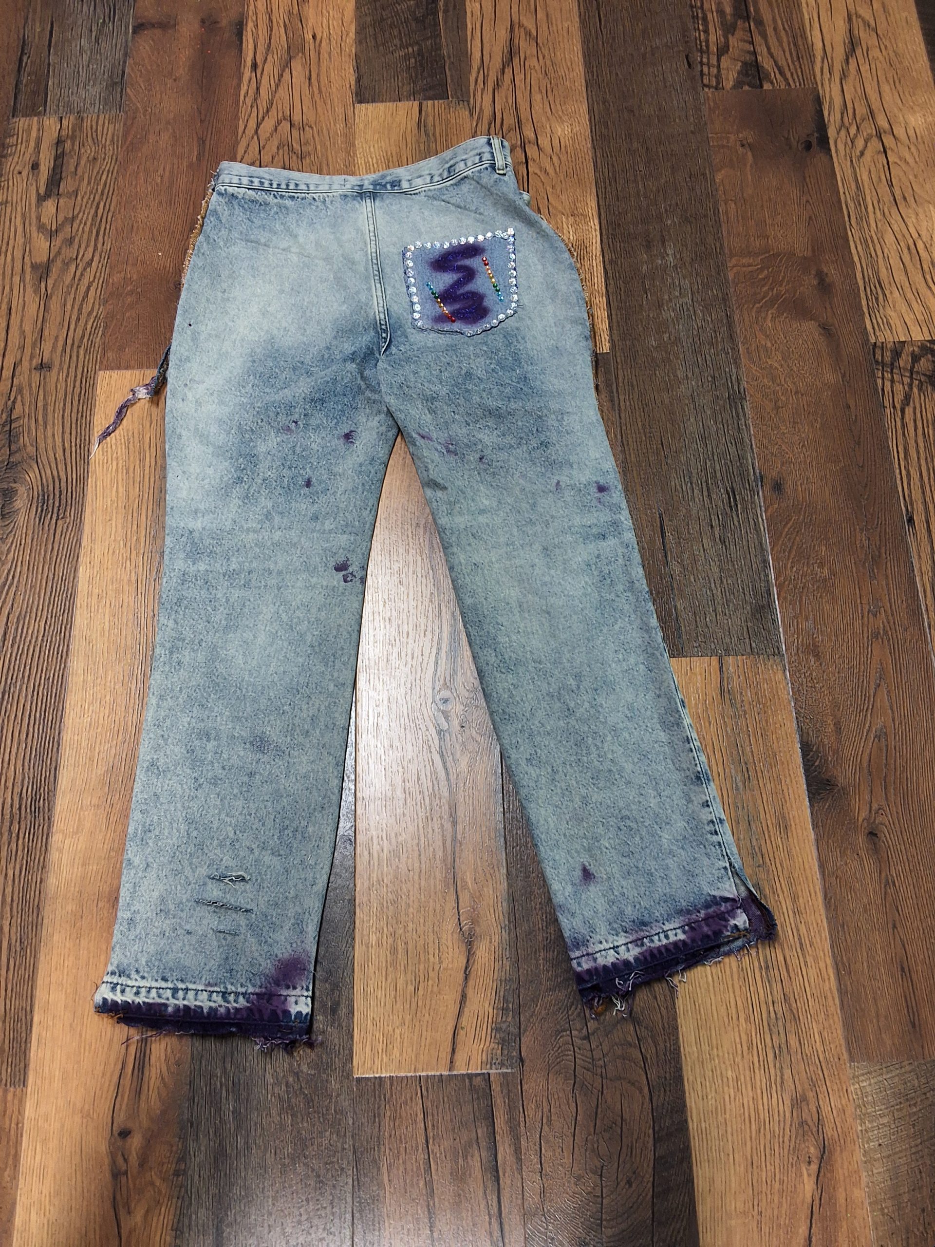 These bold, one-of-a-kind denim pants remix the classic silhouette with artistic flair. Hand-painted with deep violet tones, distressed details, and a unique layered skirt overlay, they merge street style and couture edge. The rhinestone-trimmed pocket adds just the right sparkle for that signature Maxine’s Fashion Closet statement.