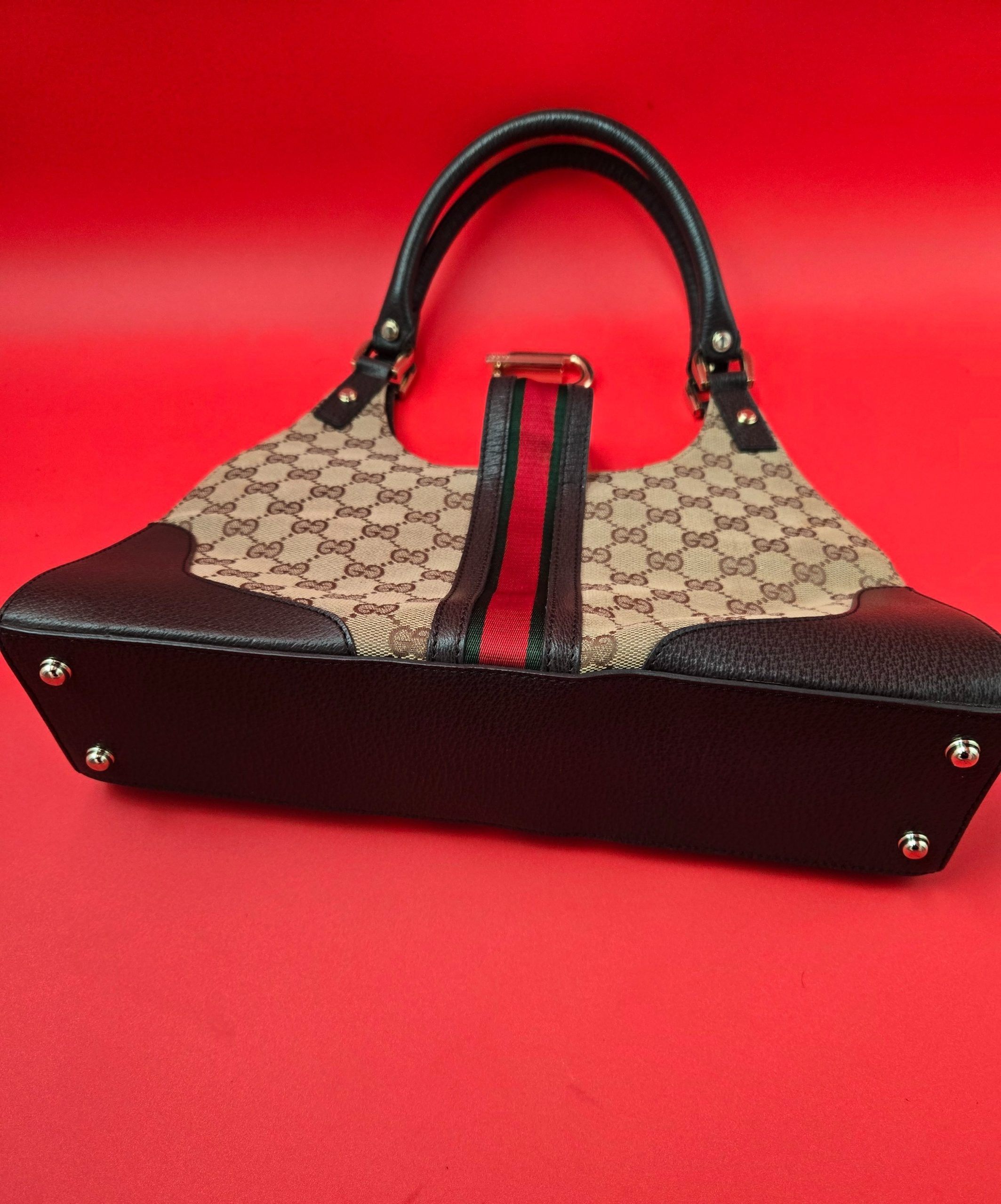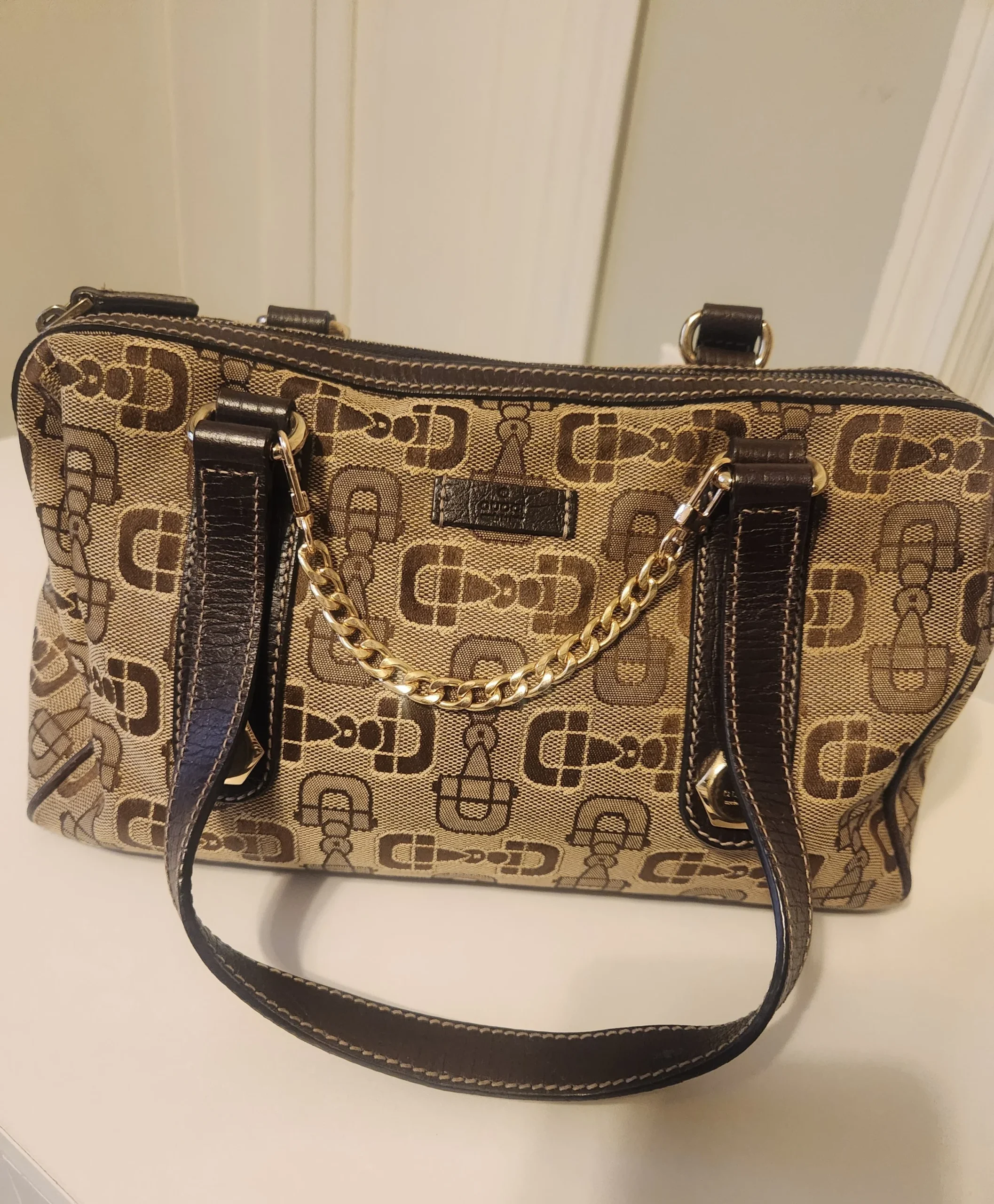 GUCCI VINTAGE 90’S LEATHER TRIMMED HORSEBIT CANVAS BOSTON HANDBAG/ SHOULDER pre-Loved.