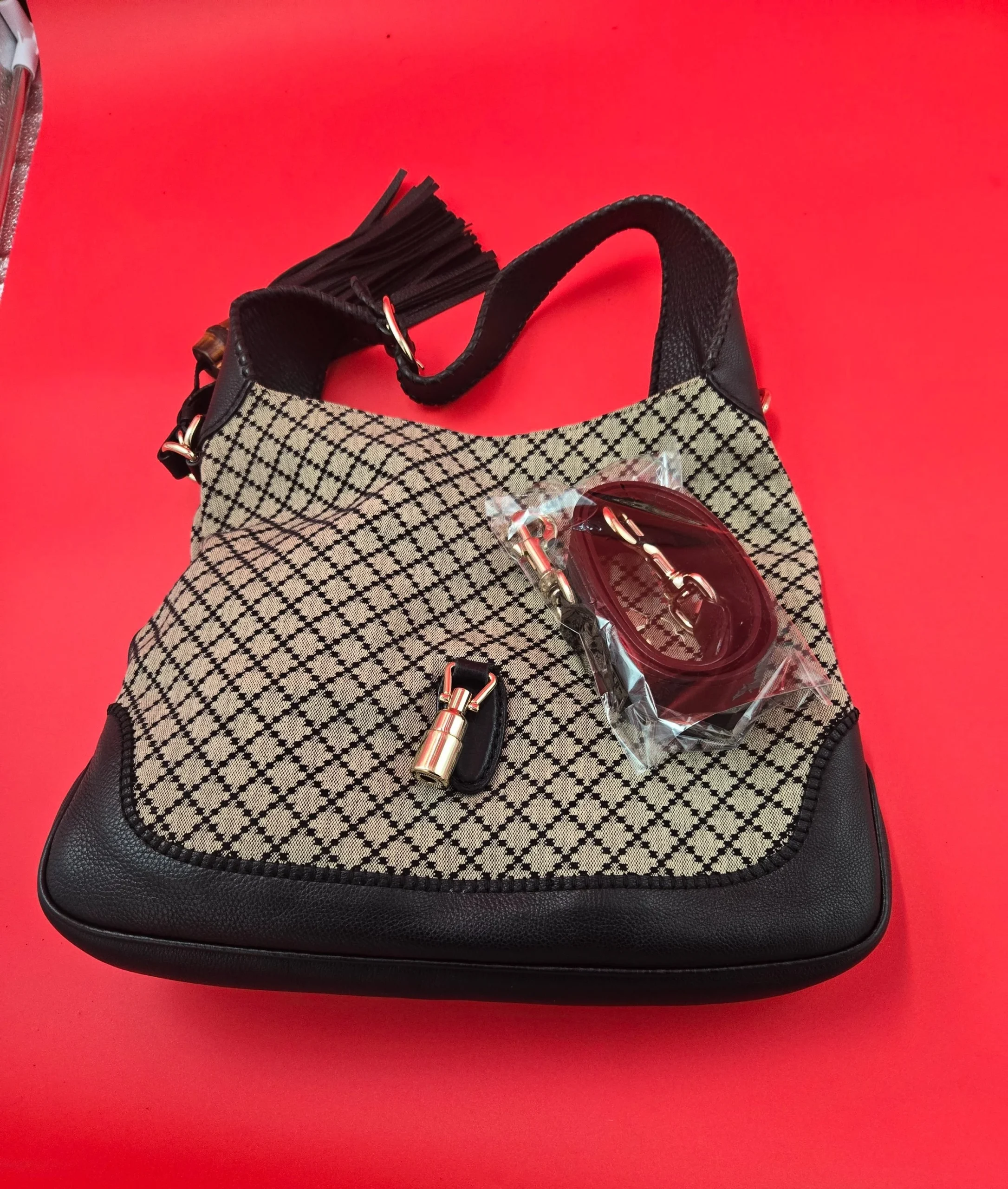 GUCCI SHOULDER BAG HANDBAG JACKIE DIAMANTE CANVAS BAMBOO TASSEL. PRE-LOVED.