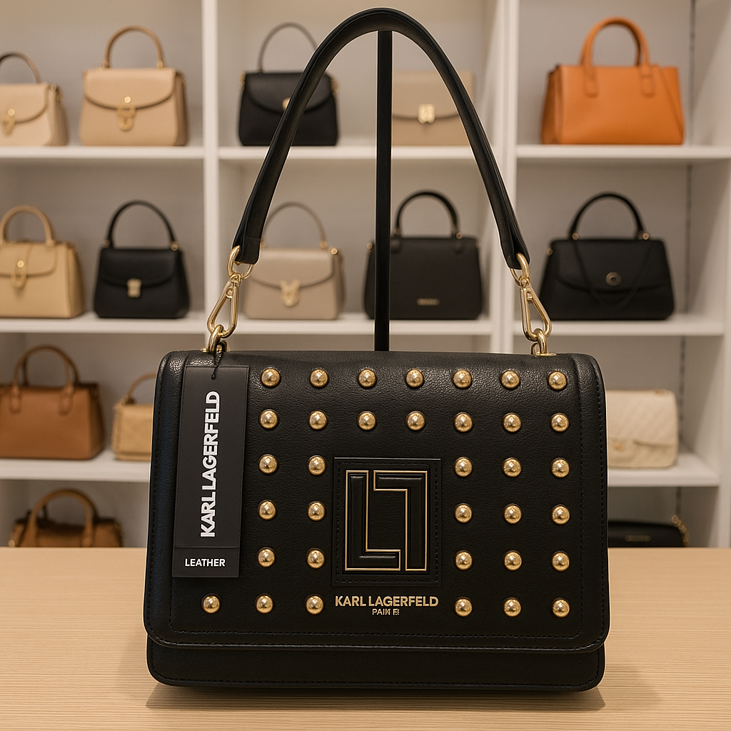 KARL LAGERFELD PARIS BLACK LEATHER TOP HANDLE CROSSBODY LEATHER STRAP WITH GOLD TONE STUD DED FLAP FRONT WITH THE ICONIC LOGO New