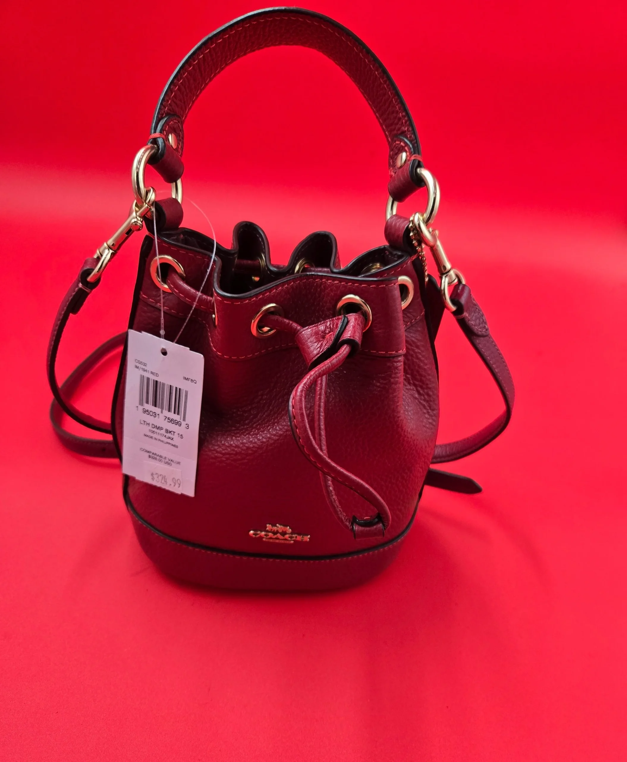 COACH DEMPSEY BUCKET DRAWSTING RED PURSE $300 NWT.